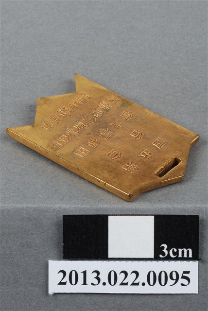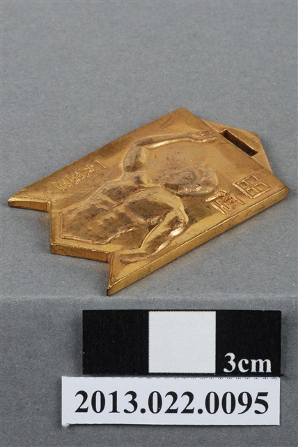 1. 第五屆全省田徑賽大會紀念獎牌為壓鑄法製成,呈扁平多邊形,狀似一面錦旗,雙面,獎牌上方有一三角形邊飾,中挖一長方形孔洞,應可作為穿繩吊掛之用。獎牌以浮雕、陽刻技法為主,不同部件分別鍍上不同的顏色做變化與裝飾。獎牌正反面皆有多處磨損和刮痕。獎牌正面浮雕出圖案與文字,以一裸上身的男子為主要形象,男子高舉右手,頭髮略長,且瀏海向後梳起,體格精壯,面部神情肅穆,五官與肌肉紋理刻畫細膩寫實。獎牌右上方陽刻「田徑」兩大字,左下角有「一九五三」字樣。獎牌背面陽刻數行文字,上至下、右至左書:「第五屆」、「全省」、「田徑賽大會」、「田徑賽協會理事長」、「吳三連敬贈」。2. 臺灣田徑賽協會為臺灣戰後,高何土於1948年成立,張星賢為第一任會長。成立後旋即舉辦臺灣省田徑賽,一共主辦50屆左右,1998年因凍省而停止舉辦。本件作品為第五屆田徑大賽,係為1953年舉辦之賽事獎牌。獎牌為大量製造之產品,壓鑄法的模具可重複使用,製作過程快,且厚度、尺寸掌握度高。