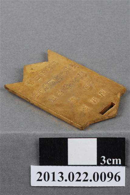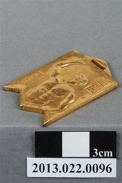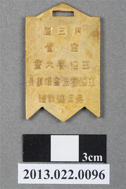 1. 第五屆全省田徑賽大會紀念獎牌為壓鑄法製成,呈扁平多邊形,狀似一面錦旗,雙面,獎牌上方有一三角形邊飾,中挖一長方形孔洞,應可作為穿繩吊掛之用。獎牌以浮雕、陽刻技法為主,不同部件分別鍍上不同的顏色做變化與裝飾。獎牌正反面皆有多處磨損和刮痕。獎牌正面浮雕出圖案與文字,以一裸上身的男子為主要形象,男子高舉右手,頭髮略長,且瀏海向後梳起,體格精壯,面部神情肅穆,五官與肌肉紋理刻畫細膩寫實。獎牌右上方陽刻「田徑」兩大字,左下角有「一九五三」字樣。獎牌背面陽刻數行文字,上至下、右至左書:「第五屆」、「全省」、「田徑賽大會」、「田徑賽協會理事長」、「吳三連敬贈」。2. 臺灣田徑賽協會為臺灣戰後,高何土於1948年成立,張星賢為第一任會長。成立後旋即舉辦臺灣省田徑賽,一共主辦50屆左右,1998年因凍省而停止舉辦。本件作品為第五屆田徑大賽,係為1953年舉辦之賽事獎牌。獎牌為大量製造之產品,壓鑄法的模具可重複使用,製作過程快,且厚度、尺寸掌握度高。