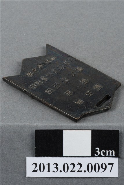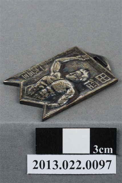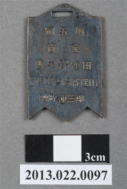 1. 第五屆全省田徑賽大會紀念獎牌為壓鑄法製成,呈扁平多邊形,狀似一面錦旗,雙面,獎牌上方有一三角形邊飾,中挖一長方形孔洞,應可作為穿繩吊掛之用。獎牌以浮雕、陽刻技法為主,不同部件分別鍍上不同的顏色做變化與裝飾。獎牌正反面皆有多處磨損和刮痕。獎牌正面浮雕出圖案與文字,以一裸上身的男子為主要形象,男子高舉右手,頭髮略長,且瀏海向後梳起,體格精壯,面部神情肅穆,五官與肌肉紋理刻畫細膩寫實。獎牌右上方陽刻「田徑」兩大字,左下角有「一九五三」字樣。獎牌背面陽刻數行文字,上至下、右至左書:「第五屆」、「全省」、「田徑賽大會」、「田徑賽協會理事長」、「吳三連敬贈」。2. 臺灣田徑賽協會為臺灣戰後,高何土於1948年成立,張星賢為第一任會長。成立後旋即舉辦臺灣省田徑賽,一共主辦50屆左右,1998年因凍省而停止舉辦。本件作品為第五屆田徑大賽,係為1953年舉辦之賽事獎牌。獎牌為大量製造之產品,壓鑄法的模具可重複使用,製作過程快,且厚度、尺寸掌握度高。