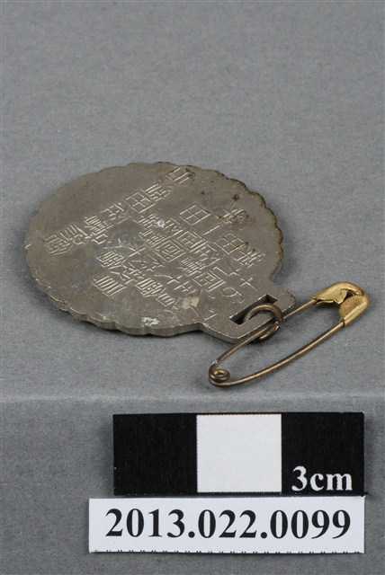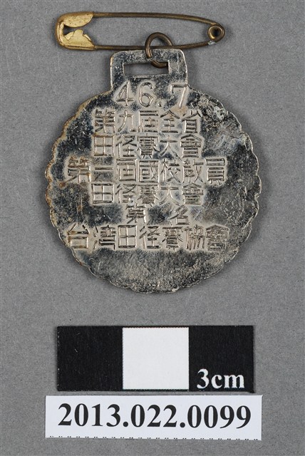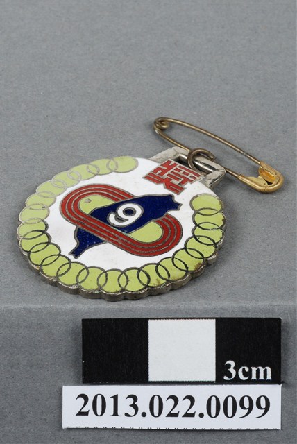 1. 臺灣田徑賽協會第9屆全省暨第1屆國教田徑賽大會名次獎牌為壓鑄法製成,呈薄圓形,雙面,上方有一凸耳,中有一長方形孔,以一環與一別針相連。獎牌以陽刻技法為主,並繪圖上色。獎牌正反面皆有多處刮痕,尤其以獎牌背面更加明顯。獎牌邊緣呈花瓣狀,正面以白、紅、藍、淺綠等顏色繪製圖案,周圍以一圓圈飾帶裝飾,頂端有一紅色「獎」字。獎牌中央繪帶有紅色跑道和綠色草地的操場,中央有藍色的臺灣穿過,臺灣圖案上有一數字「9」。獎牌背面陽刻刻滿筆畫纖細的文字,由左至右、上至下書:「46.7」、「第九屆全省」、「田徑賽大會」、「第一屆國校教員」、「田徑賽大會」、「第□名」、「台灣田徑賽協會」。其中「第□名」的數字並未刻出,本件作品可能為樣品。2. 臺灣田徑賽協會為臺灣戰後,高何土於1948年成立,張星賢為第一任會長。成立後旋即舉辦臺灣省田徑賽,一共主辦50屆左右,1998年因凍省而停止舉辦。本件作品為第9屆田徑大賽,係為民國46年舉辦,即1957年舉辦之賽事獎牌。第9屆田徑大賽亦同時為第1屆國民教育田徑大賽,國民教育簡稱「國教」。獎牌為大量製造之產品,壓鑄法的模具可重複使用,製作過程快,且厚度、尺寸掌握度高。