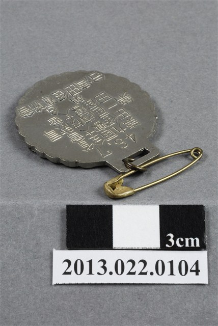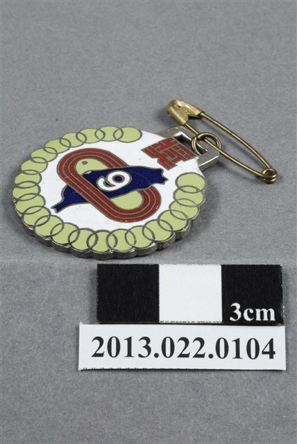 1. 臺灣田徑賽協會第9屆全省暨第1屆國教田徑賽大會名次獎牌為壓鑄法製成,呈薄圓形,雙面,上方有一凸耳,中有一長方形孔,以一環與一別針相連。獎牌以陽刻技法為主,並繪圖上色。獎牌正反面皆有多處刮痕,尤其以獎牌背面更加明顯:獎牌背面右下角有數條突起的紋路。獎牌邊緣呈花瓣狀,正面以白、紅、藍、淺綠等顏色繪製圖案,周圍以一圓圈飾帶裝飾,頂端有一紅色「獎」字。獎牌中央繪帶有紅色跑道和綠色草地的操場,中央有藍色的臺灣穿過,臺灣圖案上有一數字「9」。獎牌背面陽刻刻滿筆畫纖細的文字,由左至右、上至下書:「46.7」、「第九屆全省」、「田徑賽大會」、「第一屆國校教員」、「田徑賽大會」、「第□名」、「台灣田徑賽協會」。其中「第□名」的數字並未刻出,本件作品可能為樣品。2. 臺灣田徑賽協會為臺灣戰後,高何土於1948年成立,張星賢為第一任會長。成立後旋即舉辦臺灣省田徑賽,一共主辦50屆左右,1998年因凍省而停止舉辦。本件作品為第9屆田徑大賽,係為民國46年舉辦,即1957年舉辦之賽事獎牌。第9屆田徑大賽亦同時為第1屆國民教育田徑大賽,國民教育簡稱「國教」。獎牌為大量製造之產品,壓鑄法的模具可重複使用,製作過程快,且厚度、尺寸掌握度高。