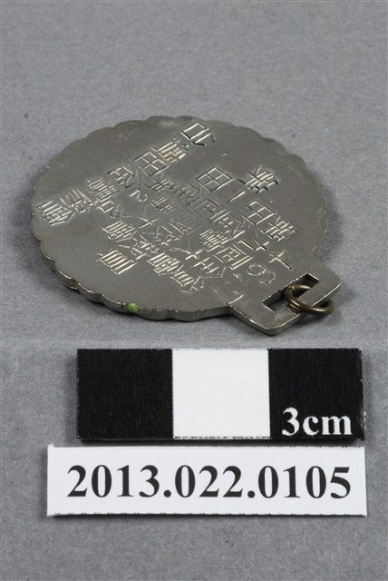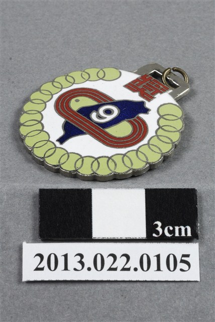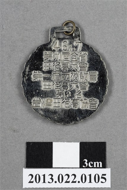 1. 臺灣田徑賽協會第9屆全省暨第1屆國教田徑賽大會第2名獎牌為壓鑄法製成,呈薄圓形,雙面,上方有一凸耳,中有一長方形孔,以一環與一別針相連。獎牌以陽刻技法為主,並繪圖上色。獎牌正反面皆有多處刮痕,尤其以獎牌正面上方凸耳處最為明顯。獎牌邊緣呈花瓣狀,正面以白、紅、藍、淺綠等顏色繪製圖案,周圍以一圓圈飾帶裝飾,頂端有一紅色「獎」字。獎牌中央繪帶有紅色跑道和綠色草地的操場,中央有藍色的臺灣穿過,臺灣圖案上有一數字「9」。獎牌背面陽刻刻滿筆畫纖細的文字,由左至右、上至下書:「46.7」、「第九屆全省」、「田徑賽大會」、「第一屆國校教員」、「田徑賽大會」、「第2名」、「台灣田徑賽協會」。其中數字「2」略為歪斜。2. 臺灣田徑賽協會為臺灣戰後,高何土於1948年成立,張星賢為第一任會長。成立後旋即舉辦臺灣省田徑賽,一共主辦50屆左右,1998年因凍省而停止舉辦。本件作品為第9屆田徑大賽,係為民國46年舉辦,即1957年舉辦之賽事獎牌。第9屆田徑大賽亦同時為第1屆國民教育田徑大賽,國民教育簡稱「國教」。獎牌為大量製造之產品,壓鑄法的模具可重複使用,製作過程快,且厚度、尺寸掌握度高。