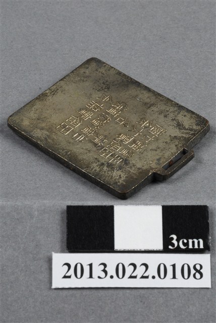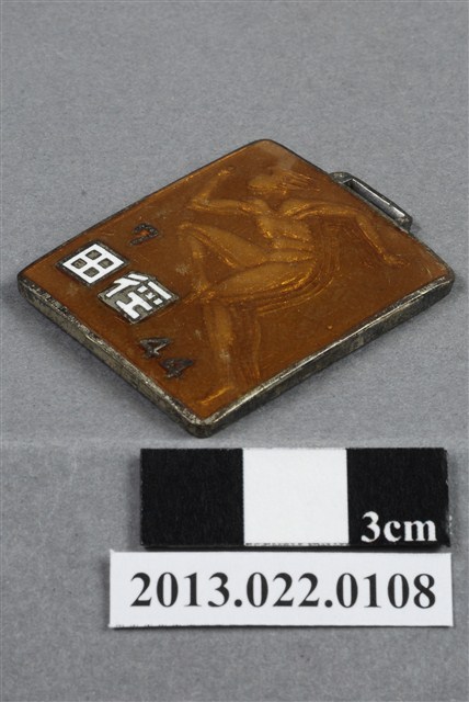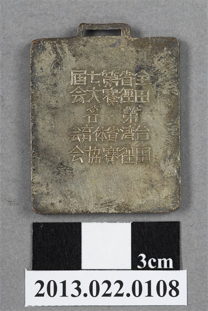 1. 臺灣田徑賽協會第7屆全省田徑賽大會獎牌為壓鑄法製成,呈平面長方形,獎牌厚度較厚,中央略微鼓起,雙面,上方有一凸起長方形耳,應為懸掛作用。獎牌以浮雕、陽刻技法為主,部分上色。獎牌正反面皆有多處磨損、刮痕與邊緣的髒污沈澱,表面另有些許鍍金時產生的不平整紋路。獎牌正面浮雕一奔跑裸男人像,頭髮向後飛揚,深目高鼻,體格健壯精實,雙臂大幅度前後擺動,上身前傾且右膝向前抬起,呈現出跑者急速奔跑的樣貌。跑者身姿重複堆疊,增加層次感與加強動態效果。然而人體細節刻畫略有失誤,畫面的跑者呈同手同腳的姿態,不符合常理。獎牌正面左下角書大字:「田徑」,上方數字「7」,右側數字「44」,為賽事舉辦屆數與年份,意即第七屆、民國44年。背面則陽刻筆畫纖細的文字,由右至左、上至下書:「全省第七屆」、「田徑賽大會」、「第□名」、「台灣省體育會」、「田徑賽協會」。2. 臺灣田徑賽協會為臺灣戰後,高何土於1948年成立,張星賢為第一任會長。成立後旋即舉辦臺灣省田徑賽,一共主辦50屆左右,1998年因凍省而停止舉辦。本件作品為第七屆田徑大賽,係為1955年舉辦之賽事獎牌,年份亦如獎牌所示。獎牌為大量製造之產品,壓鑄法的模具可重複使用,製作過程快,且厚度、尺寸掌握度高。