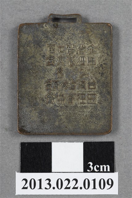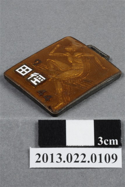 1. 臺灣田徑賽協會第7屆全省田徑賽大會獎牌為壓鑄法製成,呈平面長方形,獎牌厚度較厚,中央略微鼓起,雙面,上方有一凸起長方形耳,應為懸掛作用。獎牌以浮雕、陽刻技法為主,部分上色。獎牌正反面皆有多處磨損與刮痕,其中正面有數條較明顯的刮痕,獎牌背面則大面積鏽蝕、變色。獎牌正面浮雕一奔跑裸男人像,頭髮向後飛揚,深目高鼻,體格健壯精實,雙臂大幅度前後擺動,上身前傾且右膝向前抬起,呈現出跑者急速奔跑的樣貌。跑者身姿重複堆疊,增加層次感與加強動態效果。然而人體細節刻畫略有失誤,畫面的跑者呈同手同腳的姿態,不符合常理。獎牌正面左下角書大字:「田徑」,上方數字「7」,右側數字「44」,為賽事舉辦屆數與年份,意即第七屆、民國44年。背面則陽刻筆畫纖細的文字,由右至左、上至下書:「全省第七屆」、「田徑賽大會」、「第□名」、「台灣省體育會」、「田徑賽協會」。背面文字整體壓印歪斜,偏向獎牌右側。2. 臺灣田徑賽協會為臺灣戰後,高何土於1948年成立,張星賢為第一任會長。成立後旋即舉辦臺灣省田徑賽,一共主辦50屆左右,1998年因凍省而停止舉辦。本件作品為第七屆田徑大賽,係為1955年舉辦之賽事獎牌,年份亦如獎牌所示。獎牌為大量製造之產品,壓鑄法的模具可重複使用,製作過程快,且厚度、尺寸掌握度高。