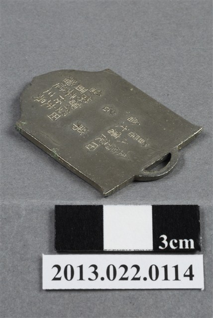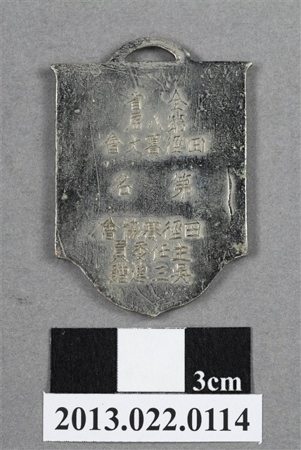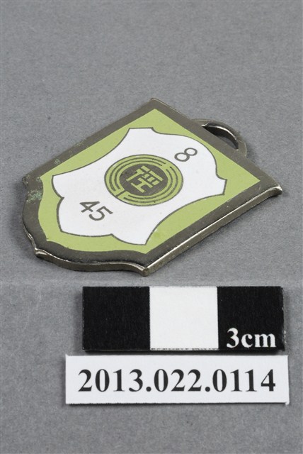 1. 臺灣田徑賽協會第8屆全省田徑賽大會獎牌為壓鑄法製成,呈平面多邊形,上半部方正,下半部呈圓弧的多邊狀,整體獎牌形似旗幟樣貌。獎牌厚度較厚,雙面,上方有一凸起弧形耳,應為懸掛作用。獎牌以浮雕、陽刻技法為主,部分上色。獎牌正反面皆有多處磨損,獎牌背面另有些許鍍金時產生的不平整紋路,邊緣多有鏽蝕痕跡。獎牌正面以淡綠色顏料沿多邊形邊勾勒出獎牌形狀,內以白色顏料繪一盾牌般的形狀,其中有文字與數字,皆為原本獎牌的金屬底色。獎牌正面上方有一數字「8」,中央繪一圈狀,形似操場與跑道,中央書一「徑」字,下方則有數字「45」,為賽事舉辦屆數與年份,意即第8屆、民國45年。背面則陽刻筆畫纖細的文字,由右至左、上至下書:「全省」、「第八屆」、「田徑賽大會」、「第□名」、「田徑賽協會」、「主任委員」、「吳三連贈」。2. 臺灣田徑賽協會為臺灣戰後,高何土於1948年成立,張星賢為第一任會長。成立後旋即舉辦臺灣省田徑賽,一共主辦50屆左右,1998年因凍省而停止舉辦。本件作品為第八屆田徑大賽,係為1956年舉辦之賽事獎牌,年份亦如獎牌所示。獎牌為大量製造之產品,壓鑄法的模具可重複使用,製作過程快,且厚度、尺寸掌握度高。