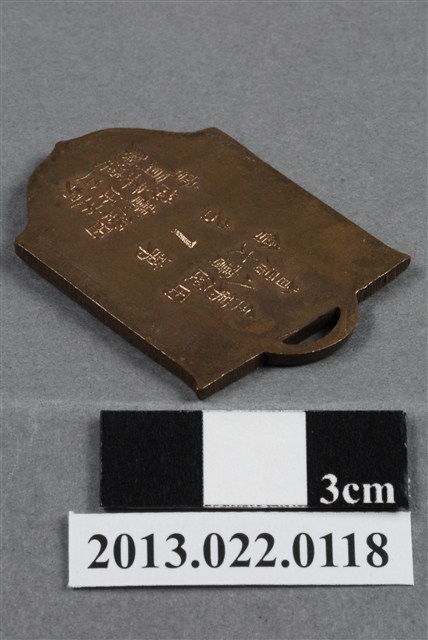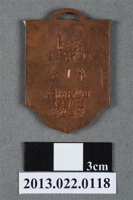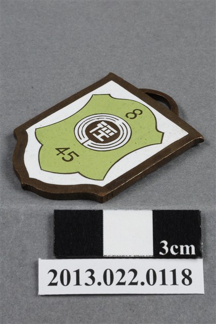 1. 臺灣田徑賽協會第8屆全省田徑賽大會第1名獎牌為壓鑄法製成,呈平面多邊形,上半部方正,下半部呈圓弧的多邊狀,整體獎牌形似旗幟樣貌。獎牌厚度較厚,雙面,上方有一凸起弧形耳,應為懸掛作用。獎牌以浮雕、陽刻技法為主,部分上色。獎牌正反面皆有多處磨損與孔洞,正面著色處有明顯的髒污痕跡。獎牌背面另有許多鍍金時產生的不平整紋路,邊緣多有鏽蝕痕跡,獎牌整體的金屬色澤帶黃且較深。獎牌正面以淡綠色顏料沿多邊形邊勾勒出獎牌形狀,內以白色顏料繪一盾牌般的形狀,其中有文字與數字,皆為原本獎牌的金屬底色。獎牌正面上方有一數字「8」,中央繪一圈狀,形似操場與跑道,中央書一「徑」字,下方則有數字「45」,為賽事舉辦屆數與年份,意即第8屆、民國45年。背面則陽刻筆畫纖細的文字,由右至左、上至下書:「全省」、「第八屆」、「田徑賽大會」、「第1名」、「田徑賽協會」、「主任委員」、「吳三連贈」。2. 臺灣田徑賽協會為臺灣戰後,高何土於1948年成立,張星賢為第一任會長。成立後旋即舉辦臺灣省田徑賽,一共主辦50屆左右,1998年因凍省而停止舉辦。本件作品為第八屆田徑大賽,係為1956年舉辦之賽事獎牌,年份亦如獎牌所示。獎牌為大量製造之產品,壓鑄法的模具可重複使用,製作過程快,且厚度、尺寸掌握度高。
