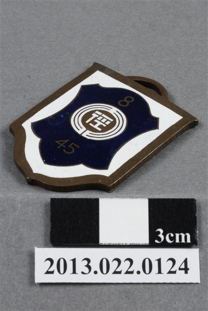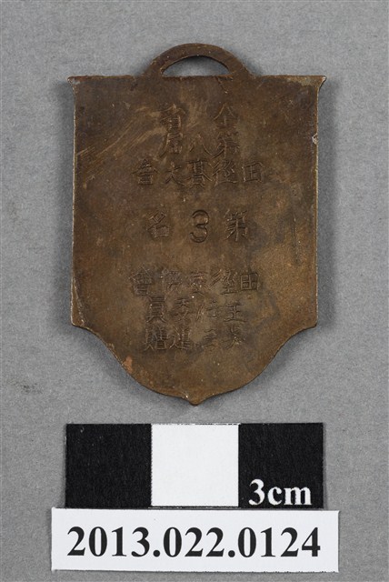 1. 臺灣田徑賽協會第8屆全省田徑賽大會第3名獎牌為壓鑄法製成,呈平面多邊形,上半部方正,下半部呈圓弧的多邊狀,整體獎牌形似旗幟樣貌。獎牌厚度較厚,雙面,上方有一凸起弧形耳,應為懸掛作用。獎牌以浮雕、陽刻技法為主,部分上色。獎牌正面以白色顏料沿多邊形邊勾勒出獎牌形狀,內以寶藍色顏料繪一盾牌般的形狀,其中有文字與數字,皆為原本獎牌的金屬底色。獎牌正反面皆有多處磨損,正面白色著色處有少許髒污斑點,藍色著色處色澤不均。獎牌背面另有許多鍍金時產生的不平整紋路,邊緣略有受損痕跡,獎牌整體的金屬色澤帶黃且較深。獎牌正面上方有一數字「8」,中央繪一圈狀,形似操場與跑道,中央書一「徑」字,下方則有數字「45」,為賽事舉辦屆數與年份,意即第8屆、民國45年。背面則陽刻筆畫纖細的文字,由右至左、上至下書:「全省」、「第八屆」、「田徑賽大會」、「第3名」、「田徑賽協會」、「主任委員」、「吳三連贈」。2. 臺灣田徑賽協會為臺灣戰後,高何土於1948年成立,張星賢為第一任會長。成立後旋即舉辦臺灣省田徑賽,一共主辦50屆左右,1998年因凍省而停止舉辦。本件作品為第八屆田徑大賽,係為1956年舉辦之賽事獎牌,年份亦如獎牌所示。獎牌為大量製造之產品,壓鑄法的模具可重複使用,製作過程快,且厚度、尺寸掌握度高。