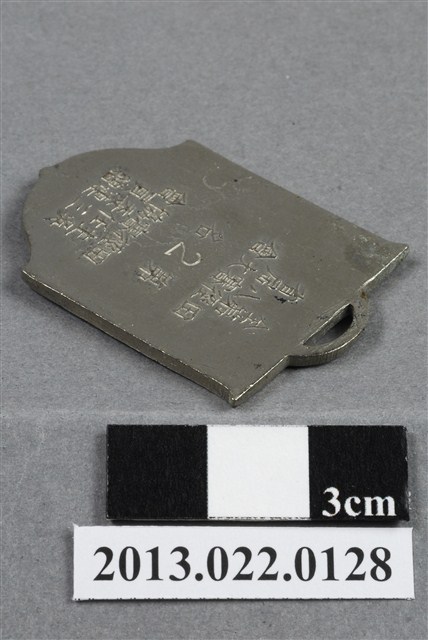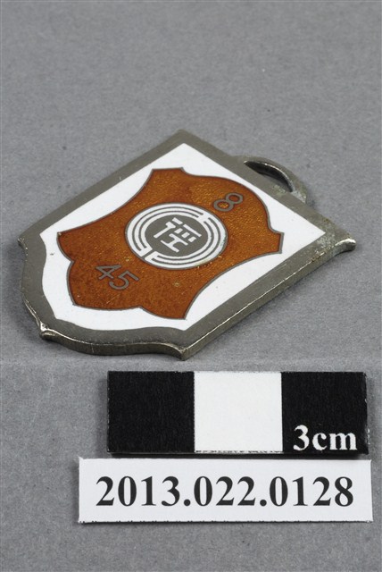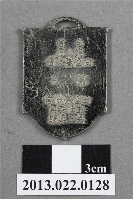 1. 臺灣田徑賽協會第8屆全省田徑賽大會第2名獎牌為壓鑄法製成,呈平面多邊形,上半部方正,下半部呈圓弧的多邊狀,整體獎牌形似旗幟樣貌。獎牌厚度較厚,雙面,上方有一凸起弧形耳,應為懸掛作用,弧形耳頂端略有變形。獎牌以浮雕、陽刻技法為主,部分上色。獎牌正面以白色顏料沿多邊形邊勾勒出獎牌形狀,內以黃褐色顏料繪一盾牌般的形狀,其中有文字與數字,皆為原本獎牌的金屬底色。獎牌正反面皆有多處磨損,邊緣略有鏽蝕,且褐色著色處色澤不均,白色著色處則有少許髒污斑點。獎牌背面另有許多鍍金時產生的不平整紋路。獎牌正面上方有一數字「8」,中央繪一圈狀,形似操場與跑道,中央書一「徑」字,下方則有數字「45」,為賽事舉辦屆數與年份,意即第8屆、民國45年。背面則陽刻筆畫纖細的文字,布排偏向獎牌右側,由右至左、上至下書:「全省」、「第八屆」、「田徑賽大會」、「第2名」、「田徑賽協會」、「主任委員」、「吳三連贈」。數字「2」為陰刻。2. 臺灣田徑賽協會為臺灣戰後,高何土於1948年成立,張星賢為第一任會長。成立後旋即舉辦臺灣省田徑賽,一共主辦50屆左右,1998年因凍省而停止舉辦。本件作品為第八屆田徑大賽,係為1956年舉辦之賽事獎牌,年份亦如獎牌所示。獎牌為大量製造之產品,壓鑄法的模具可重複使用,製作過程快,且厚度、尺寸掌握度高。