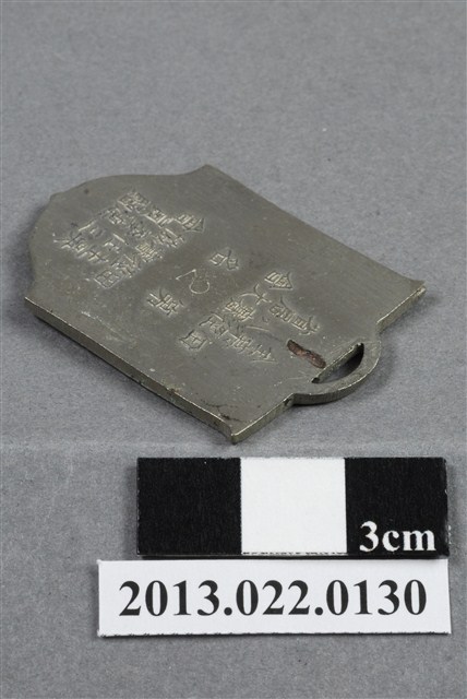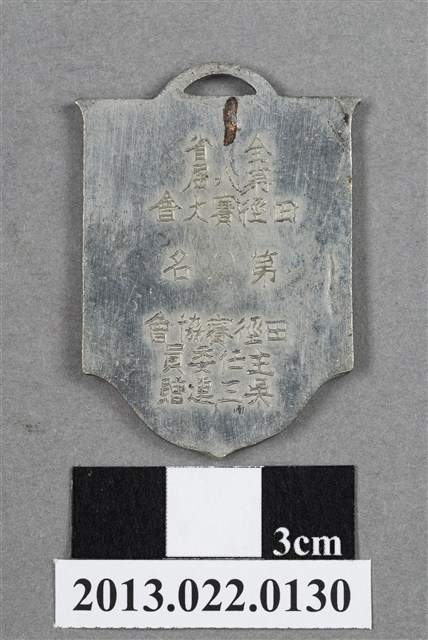 1. 臺灣田徑賽協會第8屆全省田徑賽大會第2名獎牌為壓鑄法製成,呈平面多邊形,上半部方正,下半部呈圓弧的多邊狀,整體獎牌形似旗幟樣貌。獎牌厚度較厚,雙面,上方有一凸起弧形耳,應為懸掛作用,弧形耳頂端略有變形。獎牌以浮雕、陽刻技法為主,部分上色。獎牌正面以白色顏料沿多邊形邊勾勒出獎牌形狀,內以黃褐色顏料繪一盾牌般的形狀,其中有文字與數字,皆為原本獎牌的金屬底色。獎牌正反面皆有多處磨損,邊緣略有鏽蝕,且有變形現象。正面褐色著色處色澤不均,白色著色處則有少許髒污斑點。獎牌背面另有許多鍍金時產生的不平整紋路,上端中央有一髒污塌陷痕跡,右上角亦有損傷。獎牌正面上方有一數字「8」,中央繪一圈狀,形似操場與跑道,中央書一「徑」字,下方則有數字「45」,為賽事舉辦屆數與年份,意即第8屆、民國45年。背面則陽刻筆畫纖細的文字,由右至左、上至下書:「全省」、「第八屆」、「田徑賽大會」、「第2名」、「田徑賽協會」、「主任委員」、「吳三連贈」。數字「2」為陰刻且較不明顯。2. 臺灣田徑賽協會為臺灣戰後,高何土於1948年成立,張星賢為第一任會長。成立後旋即舉辦臺灣省田徑賽,一共主辦50屆左右,1998年因凍省而停止舉辦。本件作品為第八屆田徑大賽,係為1956年舉辦之賽事獎牌,年份亦如獎牌所示。獎牌為大量製造之產品,壓鑄法的模具可重複使用,製作過程快,且厚度、尺寸掌握度高。