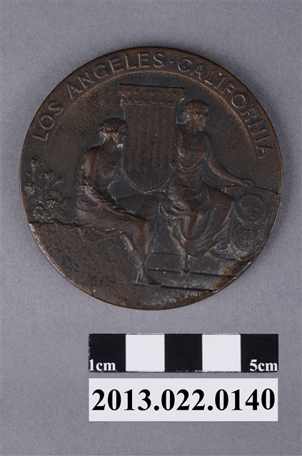 1. 第10屆夏季奧運洛杉磯參賽紀念獎牌為壓鑄法製成,呈扁平的圓形,雙面刻有圖文,整體厚度略厚。紀念獎牌以浮雕、陽刻技法為主。正反面皆有些許刮痕與鏽蝕痕跡,並有大片氧化的變色現象。紀念獎牌正面中央高浮雕一雙手握著長條旗幟揮舞的男子,裸上身,著短褲,身材精壯厚實,浮雕出清楚的肌肉線條。男子腳下刻有一線,暗示地面水平線。旗幟上浮雕文字,由左至右、上至下書:「XTH OLYMPIAD 1932」,即1932年舉辦的第10屆奧林匹克運動大會。紀念獎牌背面中央刻有兩位身著長袍、坐著的女子,兩者之間為美國之盾,浮雕出具有辨識意義的星星狀與長條紋。右側女子左手扶著另一面盾牌,其中分別為加州州徽與洛杉磯市徽。左側女子身旁的花圃種著花菱草,又稱加州罌粟,是加州的代表植物。最上端由左至右浮雕:「LOS ANGELES.CALIFORNIA」,即本屆奧運舉辦地美國加州洛杉磯市。2. 本件作品為1932年在加州洛杉磯舉辦的夏季奧運所鑄造的紀念獎牌。本屆奧運是獎牌收藏者張星賢先生首度參與奧運,也是首位參與奧運的臺灣人,具有重大意義。張星賢於本屆奧運報名四百公尺短跑、四百公尺跨欄以及一千六百公尺接力等項目。
