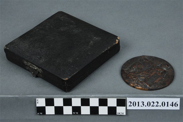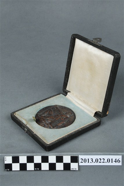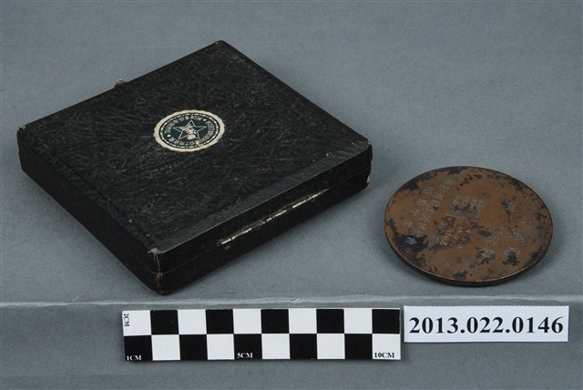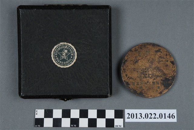 昭和十年南滿洲陸上競技協會記錄章組含一面圓形獎牌以及收納獎牌的墨色方形盒。1932年日本政府在中國東北成立傀儡政權——滿洲國,表面上由清朝末代皇帝溥儀執政,實為日本的殖民地。本件作品的滿洲以及撫順炭鐵,都呼應了當時日本經營滿洲國的歷史。本件作品由張昭平先生捐贈張星賢先生的體育文物,而本件作品對張星賢先生有密切的關聯和回憶。張星賢自早稻田大學畢業後,先留在東京找工作。直至三月中旬南滿洲鐵道株式會社成立並招考職員,他參加考試後順利考取。「滿鐵」對於體育運動非常重視,每年都會定期舉辦對抗賽之外 ,也經常與日本各大學往來交流、舉辦對抗賽。張星賢先生亦於滿鐵時期參加許多比賽,並獲得好成績。