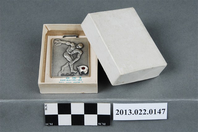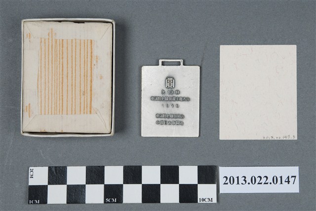 第13回東海陸上競技選手權大會紀念獎牌組含一面長方形獎牌以及收納獎牌的白色紙盒。東海是日本區域劃分之一地帶,包含愛知縣在內,因此東海陸上競技選手權大會便是在日本愛知縣名古屋舉辦的田徑賽事,為區域型的運動賽事。第13回舉辦於1970年,如獎牌上所示。本組作品為張星賢先生舊藏,張星賢曾在日本早稻田大學留學,並參與兩次奧運,退役後提拔了許多優秀的臺灣田徑選手。而張星賢先生與名古屋中京大學的關係十分友好密切,因此也將許多臺灣選手送至中京大學遊學、訓練。本組作品可能也是因而被張星賢先生所收藏。