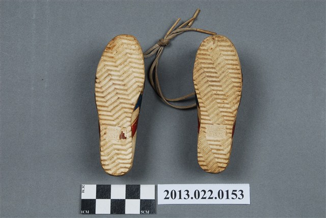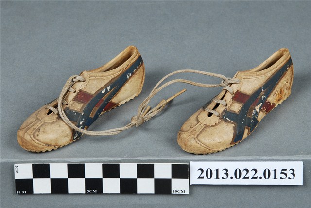 1. 本雙白底紅藍條紋運動鞋原為奧運十項全能競賽選手楊傳廣所有,而後致贈給其教練張星賢。由塑膠皮製成,綁有鞋帶,鞋面和鞋身以白色為底,兩側紅藍條紋配色為經典款MEXICO 66鞋款的配色,後踵外側處印有「Tiger®」商標及「JAPAN」字樣。鞋底為白色塑膠製成,壓印交錯的斜條紋,近鞋跟處印有「Onitsuka Tiger®」商標。2. 楊傳廣,綽號「亞洲鐵人」,生於1933年臺東廳,為馬蘭部落的阿美族人,1960年曾代表中華民國參加羅馬奧運十項全能競賽獲得銀牌,是臺灣史上第一枚奧運獎牌,後來更在在美國加州聖安東尼運動會上,創下十項運動9121分的世界紀錄,成為第一位超過9000分大關的選手。3. 張星賢(1910-1989)為臺灣田徑選手,出生於初生於日治時期的臺中廳,1932年代表日本參與洛杉磯奧運,為臺灣首位奧運選手,1948年擔任首屆臺灣省田徑協會會長,以教練身份培訓、指導新一代臺灣田徑選手,例如陳英郎、楊傳廣、紀政等人。
