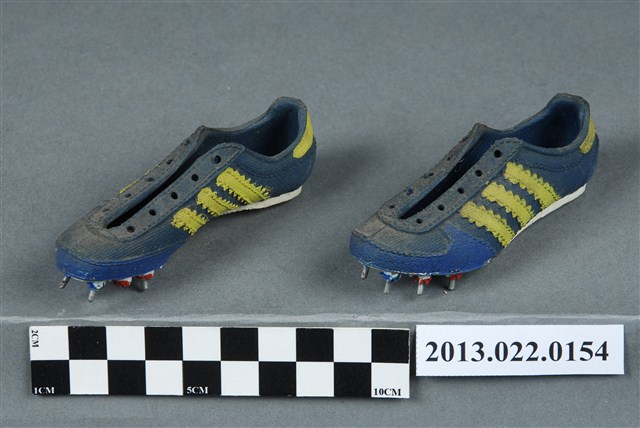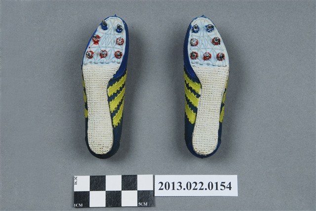 1. 本雙藍底黃條紋釘鞋原為奧運十項全能競賽選手楊傳廣所有,而後致贈給其教練張星賢。由塑膠皮製成,鞋面和鞋身以藍色為底,鞋身兩側縫有三條黃色鋸齒狀飾帶,為德國知名運動品牌adidas的經典圖案,後踵護片亦為黃色,與三條紋呼應,原本應綁有鞋帶,現已佚失。鞋底為淺藍和白色配色,腳掌處各有七根釘子,釘子根部分別圖有藍、紅色顏料,後半部壓印格狀紋路。