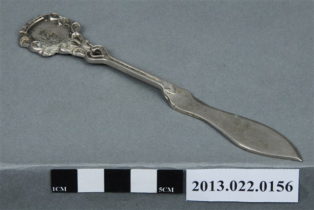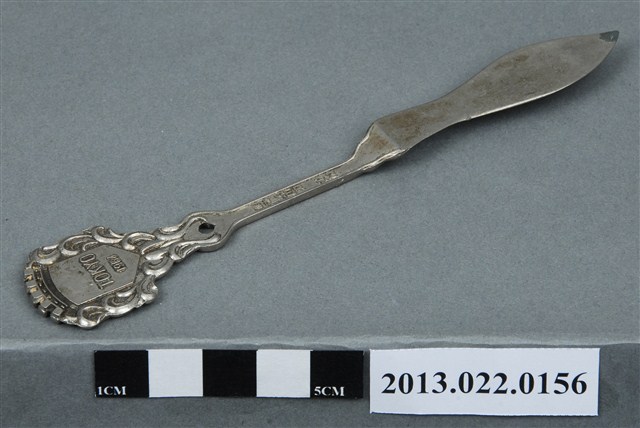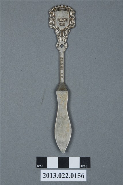 1.本物件為1964年東京奧運紀念奶油刀,金屬材質。刀柄握把處有精美花紋圖樣,背面有「TOKYO」、1964、「SILVER」、「P.3」字樣。第18屆夏季奧林匹克運動會,於1964年10月10日至10月24日在日本東京舉行。1964年東京奧運張星賢原本想要以中華民國田徑教練的身分再次參加,但最後仍無法成為代表隊教練。