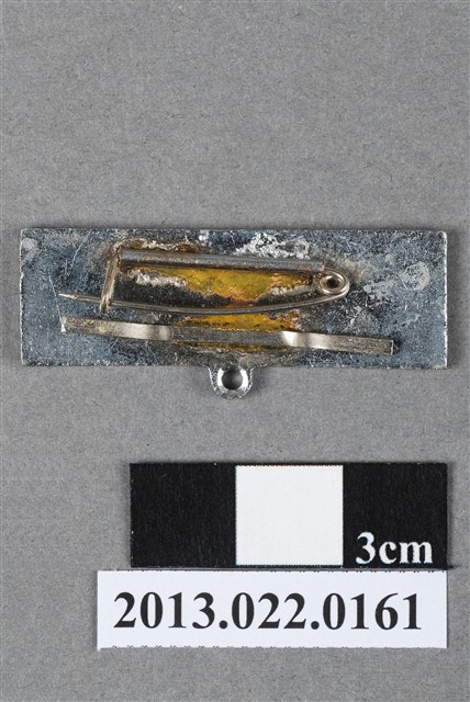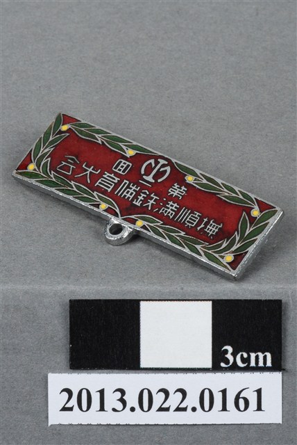 1.本物件為第1屆撫順滿鐵體育大會紀念徽章,金屬材質。紀念章正面字樣為「第1回撫順滿鉄体育大会」,底色為紅色,四邊有樹葉裝飾,背面為別針裝置。本物件表面有鏽蝕現象。