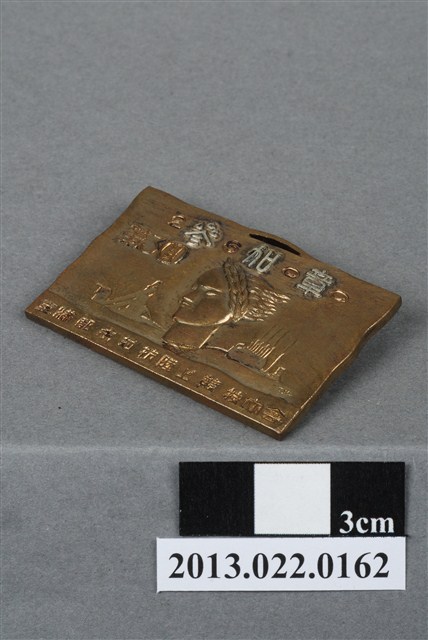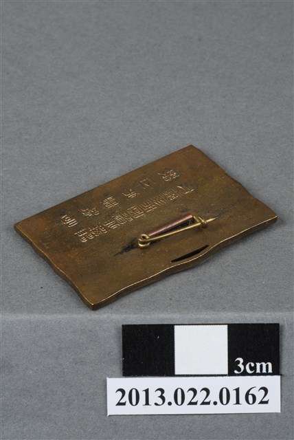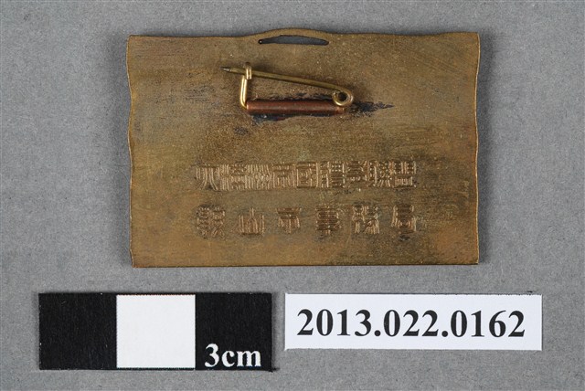 1.本物件為第3屆全滿都市對抗陸上競技大會參加紀念徽章,金屬材質。紀念章正面字樣為「參加章」、「第3回全滿都市對抗陸上競技大会」,另有戴著桂冠葉花環之人頭像與工廠排煙圖樣,工廠應為鞍山昭和製鋼所;背面字樣為「大滿州帝國體育聯盟」、「鞍山市事務局」,另有別針裝置。本物件表面有鏽蝕現象。