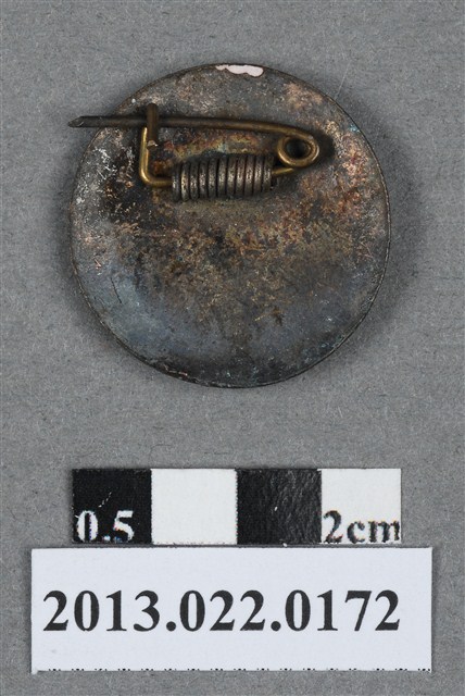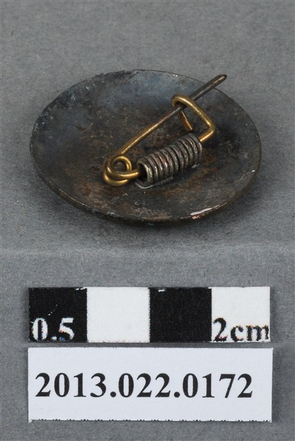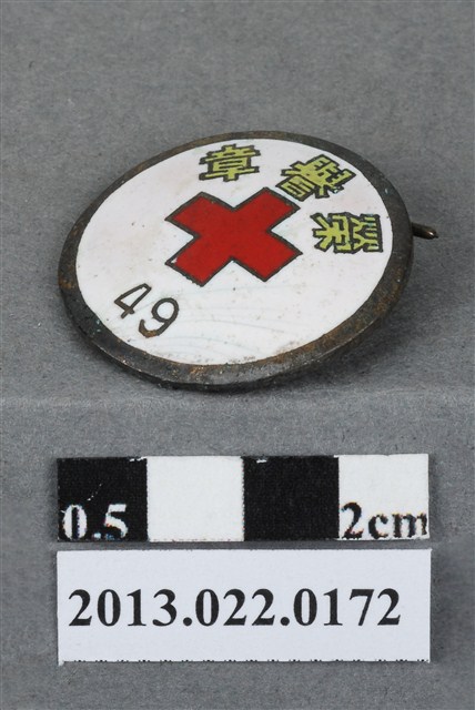 本物件為紅十字會榮譽紀念徽章,金屬材質。紀念章正面字樣為「榮譽章」、49,另有紅十字圖樣,圖樣下為白底。背面有別針裝置,本物件表面有鏽蝕現象。