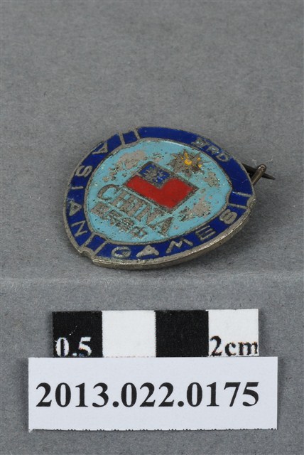 1.本物件為民國47年第3屆亞洲運動會紀念徽章,金屬材質。紀念章正面有「CHINA」、「中華民國」、「ⅢRD」、「ASIAN GAMES」字樣,以及中華民國國旗圖樣。第3屆亞洲運動會於1958年5月24日至6月1日在日本首都東京舉行,中華代表團中田徑代表隊的教練團領隊之一為張星賢,此徽章應為中華代表團成員所配戴。徽章背面有別針裝置,本物件表面有鏽蝕現象。
