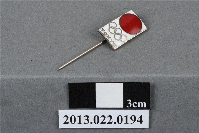 1. 本件1964東京奧運紀念章原為張星賢先生之收藏品,由其四子張昭平先生捐贈給臺灣歷史博物館。此為插針式金屬沖壓徽章,背面接有單支長針,造型呈長方形,正面圖案由日本國旗、銀色的奧林匹克五環和「TOKYO」字樣組成。徽章背面呈銀色,表面可見鐵金屬氧化的褐色鏽斑。2. 1964東京奧運是於1964年10月10日至10月24日,在日本東京都舉行的夏季奧林匹克運動會,是日本首次舉辦的奧運會,也是第一場在亞洲國家舉辦的奧運會。在此之前日本曾經取得1940年奧運會的主辦權,但因第二次世界大戰爆發而停辦,1964年再度獲得奧運主辦權並順利舉行,象徵著二戰後日本的改革與轉型。