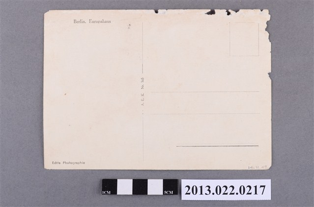1.德國柏林歐洲之家商業大廈,未經書寫的明信片,明信片上的圖片印刷柏林商辦大樓建築「歐洲之家」(Europahaus)之黑白照片。照片從建築的對街拍攝,大樓由1幢約4層樓高建築與1幢約10層樓高的長方體建築組成,建築外觀有「ALLIANZ VERSICHERUNG」、「EMELKA」等商業招牌。照片中街道商店林立,路上車水馬龍,也有許多穿著正裝的行人或穿越街道、或沿著人行道行走,呈現商辦大樓附近繁華熱鬧的景象。明信片另一面印刷書寫格式,包含撰寫地址與收件人的橫線與黏貼郵票的格線,中央分隔線上並印有「A.E.K. Nr. 505」字樣;左上角有照片名稱「Berlin. Europahaus」。2.本件明信片中的建築物「歐洲之家」(Europahaus)位於德國柏林十字山(Kreuzberg,或譯作「克羅伊茨貝格」),為1926年起造、1931年完工的建築,是一座採用「新即物主義」風格設計的商業大樓。歐洲之家起初由建築師理查德比倫伯格(Richard Bielenberg,1871-1929)和約瑟夫莫塞(Josef Moser)規劃,但遇到建設上的困難,並在1929年比羅伯格去世時一度停工。而後另一建築師奧托菲爾(Otto Firle,1889-1966)加入調整規劃設計,最後才完工啟用。歐洲之家為商辦大廈,在外觀上隨著落成後商業組織進駐而產生改變。本件明信片呈現之圍繞在建築外觀的「Allianz Versicherung」(Allianz Insurance,安聯歐洲股份公司)大型招牌相當搶眼,為柏林過去著名的地標之一。