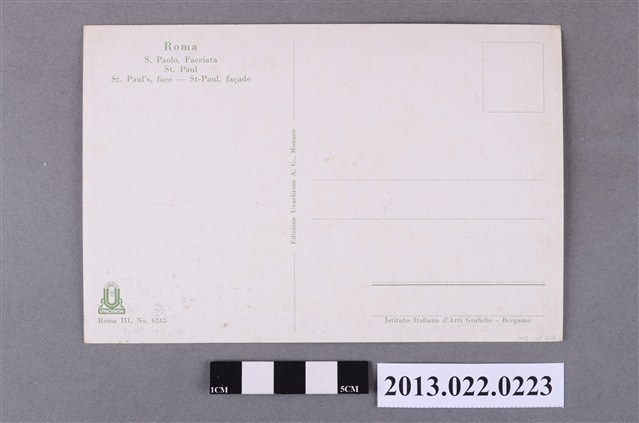 1.義大利羅馬城外聖保祿大教堂,彩色印刷明信片,明信片圖片印有城外聖保祿大教堂的正立面外觀。照片前景呈現城外聖保祿教堂外庭院之景,庭院中央矗立著將劍舉在胸前的聖保祿大理石雕像。雕像後方為聖保祿大教堂的正立面,可見到教堂外圍的列柱迴廊,而上方則是鑲嵌畫,主題可分成三個部分,包括山形牆上坐在寶座上以君王姿態呈現的基督與陪侍兩側的保祿和伯多祿、中間橫窄幅為象徵基督的救世羔羊與象徵十二宗徒的12隻羔羊,而下方分別立於拱窗間的人物則為4位舊約聖經中的先知。明信片的書寫面印有書寫格式,包含撰寫地址與收件人的橫線與黏貼郵票的格線,中央分隔線上並印有「Edizione Uvachrom A. G., Monaco」字樣;左下角印有明信片發行單位之商標與商品編號「Roma III, No. 6242」;左上角印有外文照片名稱與簡介:「Roma」、「S. Paolo, Facciata St. Paul St.Paul’s, face— St-Paul, facade」。2.位於義大利羅馬的城外聖保祿大教堂是天主教四座特級宗座聖殿之一,為天主教宗徒聖保祿的主要朝聖地。城外聖保祿大教堂的興建具有悠久歷史,起造於4世紀,當時由羅馬帝國君士坦丁大帝下令在聖保羅的墳墓上方起建教堂,即為今址。教堂經過幾世紀的裝飾和強化,也融合了許多不同時期的建築藝術元素,包含早期基督教風格、拜占庭、文藝復興以及巴洛克風格等。不幸的是,本座教堂於1823年7月15日發生火災,部分建築遭到摧毀,現今所見面貌則以保留原有的建築元素為前提重建。