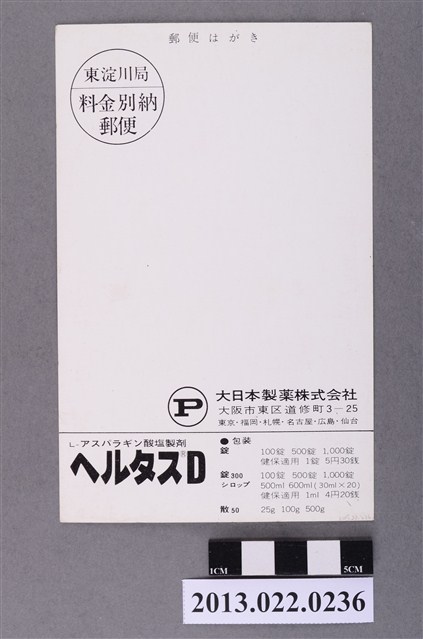 1.本物件為1936年日本選手於柏林奧運登場成績紀念廣告明信片,材質為紙質。明信上有1幅圖畫,畫面中央有1名男子頭戴桂冠葉花環,男子上方有奧運五環圖樣,右下方有柏林布蘭登堡門頂中央勝利女神雕像圖樣。圖畫上的字樣為「GERMANY」、「BERLIN」、1936、1-16、「AUGUST」、「OLYMPIC GAMES」。透過明信片下方的日文介紹詞,可得知日本參與此屆奧運的運動員包含前畑秀子。明信片背面為大日本製藥株式會社相關廣告資訊,包含地址、產品介紹與價格。
