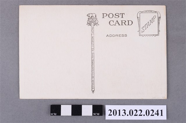 1.美國加州Oleander Avenue地區風景,是一張彩色風景圖片明信片,明信片主題為美國加州Oleander Avenue的景色。明信片整體作橫式設計,圖片於明信片中未滿版,四周留白,左下角留白處印有「AN OLEANDER AVENUE CALIFORNIA」之圖片名稱,右下角有明信片出版編號「C-1225」。圖片描繪由畫面下方延伸至左方遠方的直行路面,路旁兩側花朵盛開,遠方天空並點染漸層橙橘色,呈現加州天氣晴朗、生意盎然的美景。本件明信片另一面為書寫面,明信片未曾經過書寫,上留有「POST CARD」、郵票黏貼處、「ADDRESS」、「PACIFIC NOVELTY CO. SAN FRANCISCO& LOS ANGELES」等書寫格式及出版商資訊之文字。2.歷史上可追溯到的第1張明信片出現在奧匈帝國,當時維也納經濟學教授Dr. Emanuel Herrmann在the Neue Freie Presse報紙中發表文章,提出應有一種可以讓信件內容更簡短、寄送時更便宜、更有效率的通信方式。如此的意見不久後被奧地利郵政採納,並在1869年10月1日付出實踐。1880年代,明信片開始出現附加圖像。1890年代,攝影開始被用於明信片設計中,並在接下來的20世紀上半葉,隨著旅遊發達,迎來了明信片發行與收藏熱潮。明信片的一面圖片題材也愈趨多元,包含自然風景、歷史古蹟、旅遊景點等,本件明信片亦屬之。