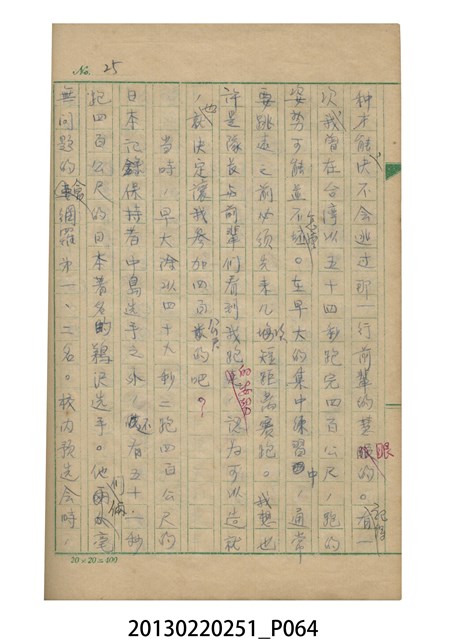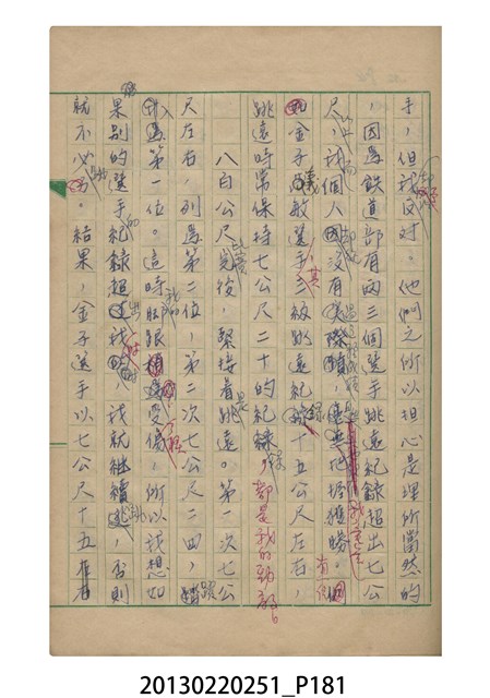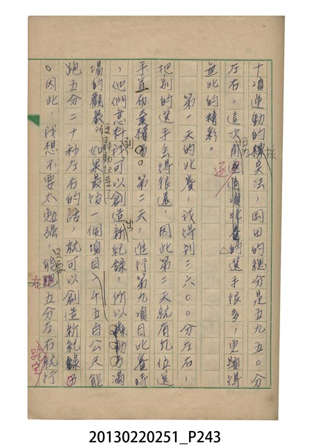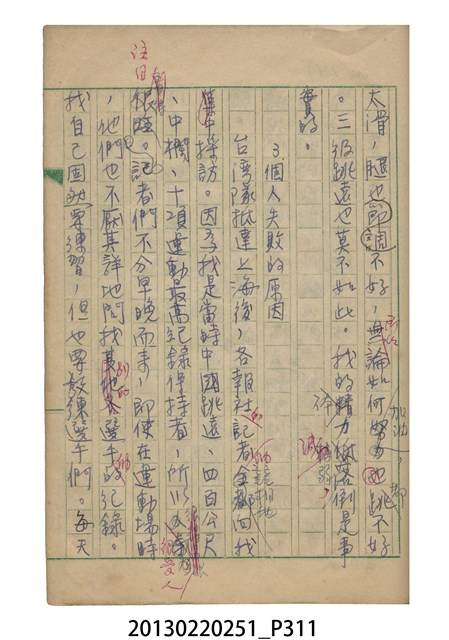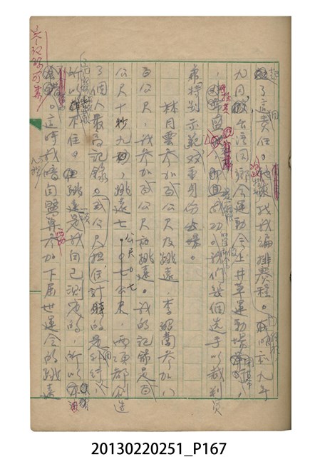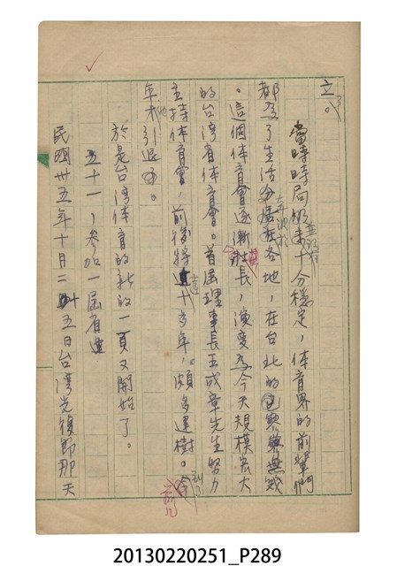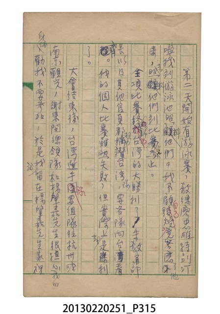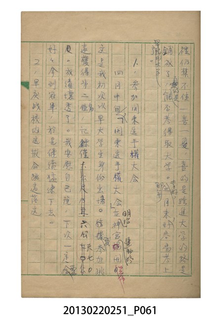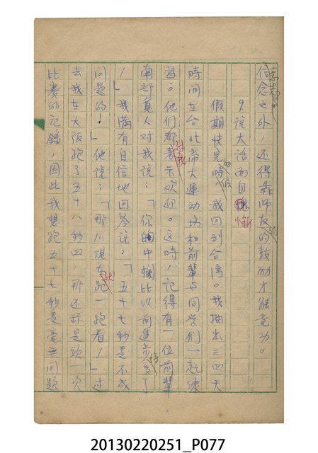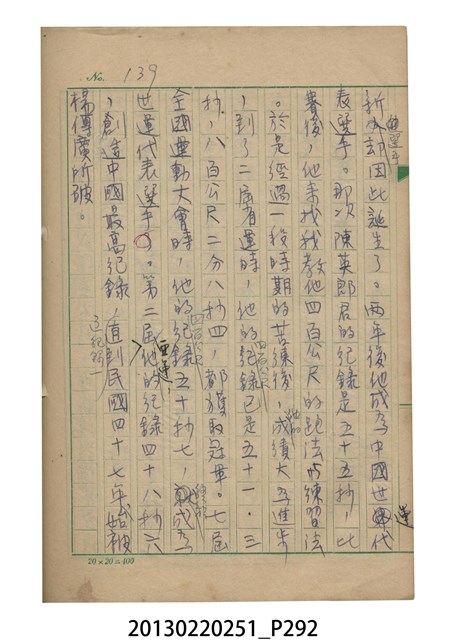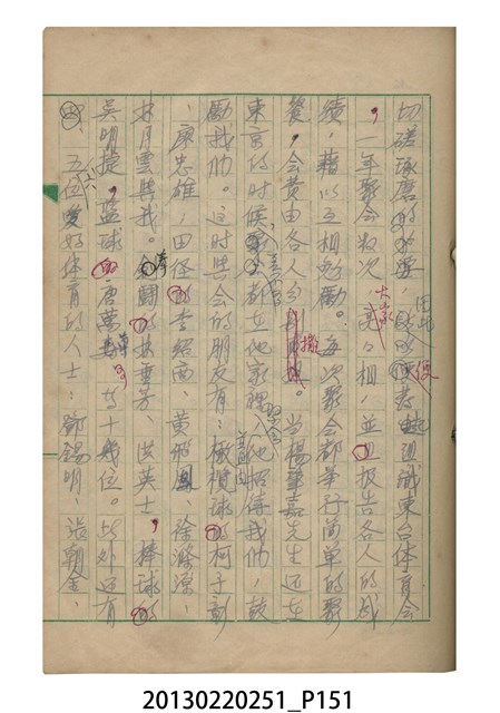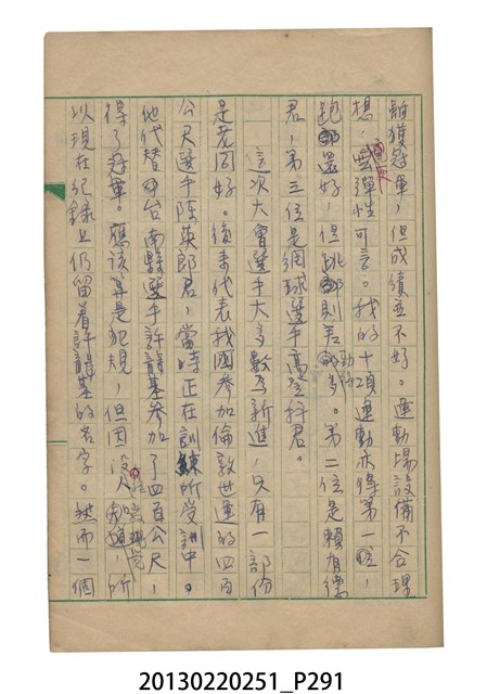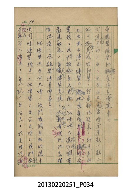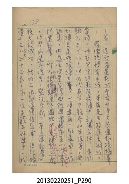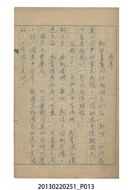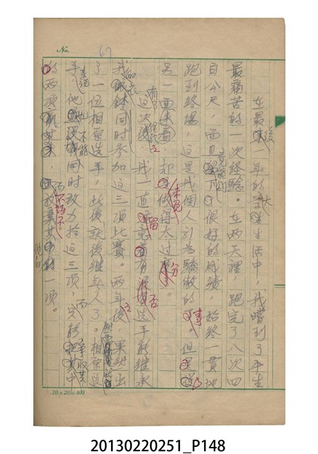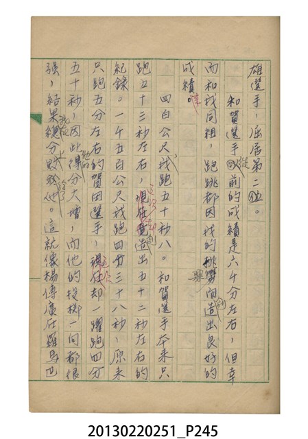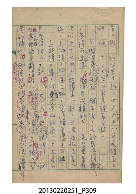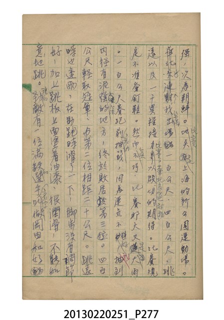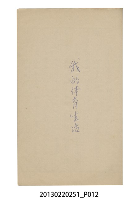 1.本物件為張星賢撰〈我的體育生活〉中文手稿謄本。封面為白色線裝,上面有手寫之「我的體育生涯」題名與「張星賢」簽名。目錄共分為65章,從少年時期(推測是1918年)開始,到1948年參加上海全國運動會之後高掛跑鞋為止,詳細陳述其運動生涯與心路歷程。