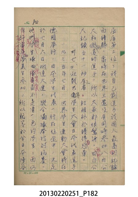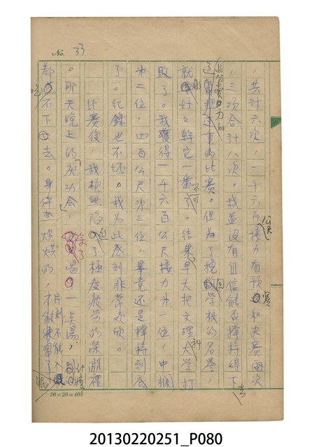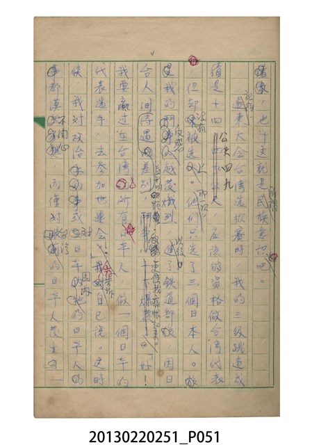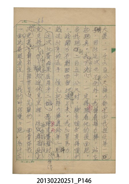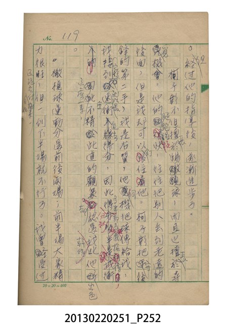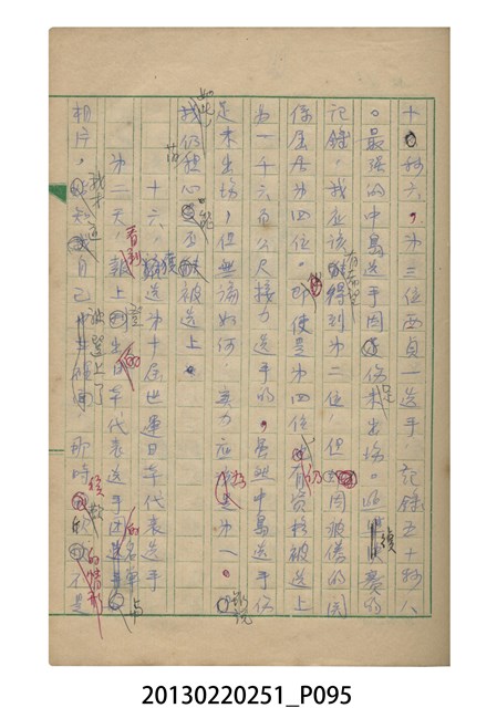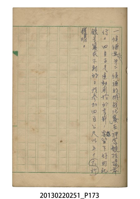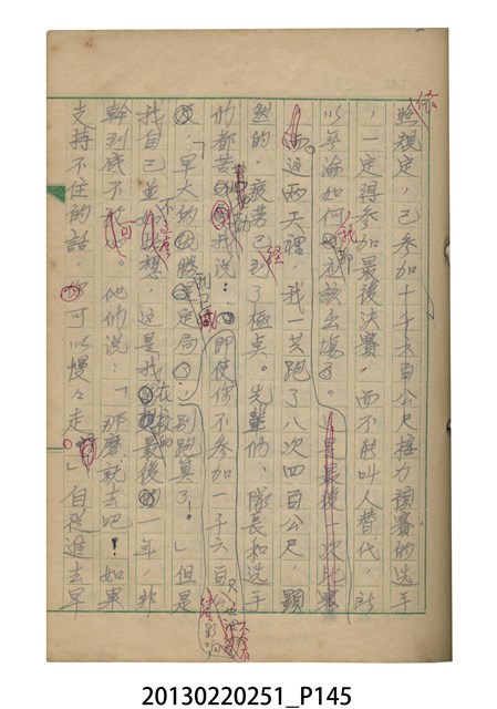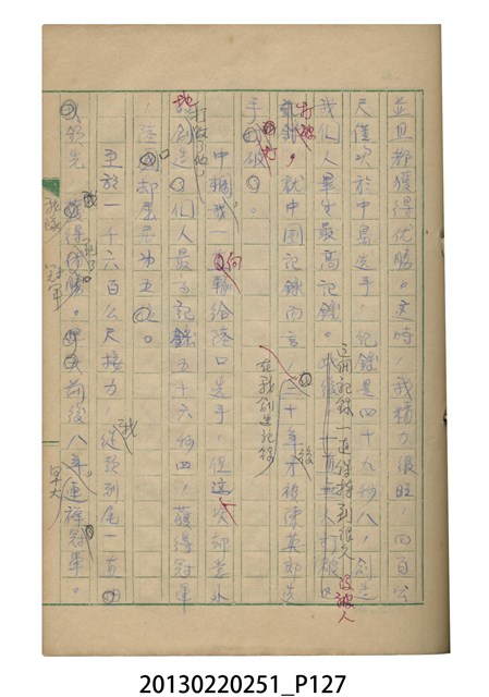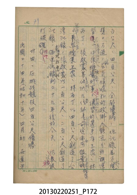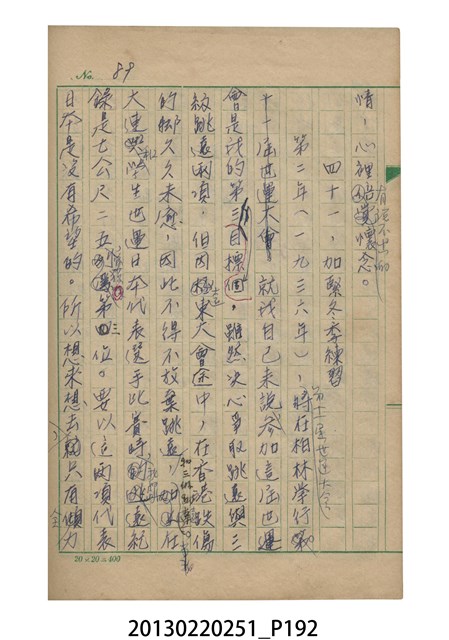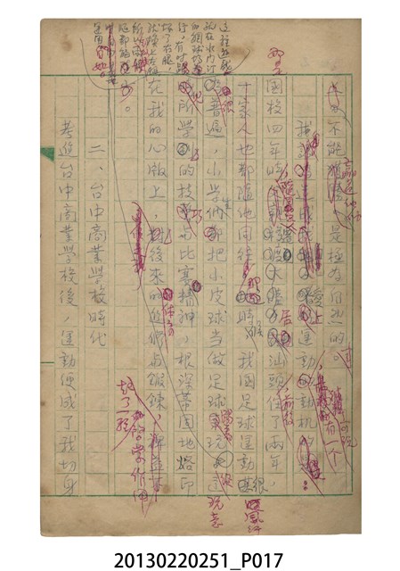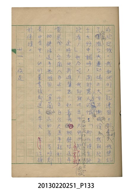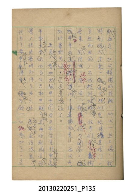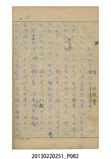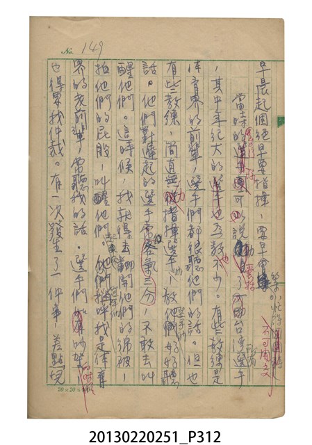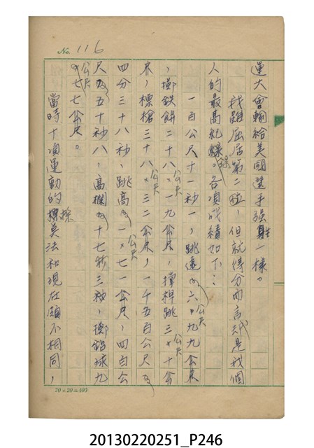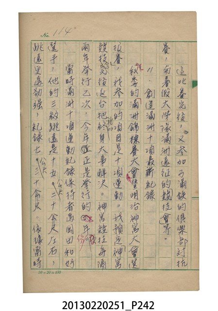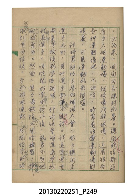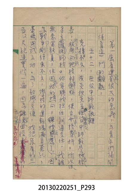 1.本物件為張星賢撰〈我的體育生活〉中文手稿謄本。封面為白色線裝,上面有手寫之「我的體育生涯」題名與「張星賢」簽名。目錄共分為65章,從少年時期(推測是1918年)開始,到1948年參加上海全國運動會之後高掛跑鞋為止,詳細陳述其運動生涯與心路歷程。