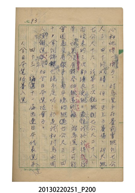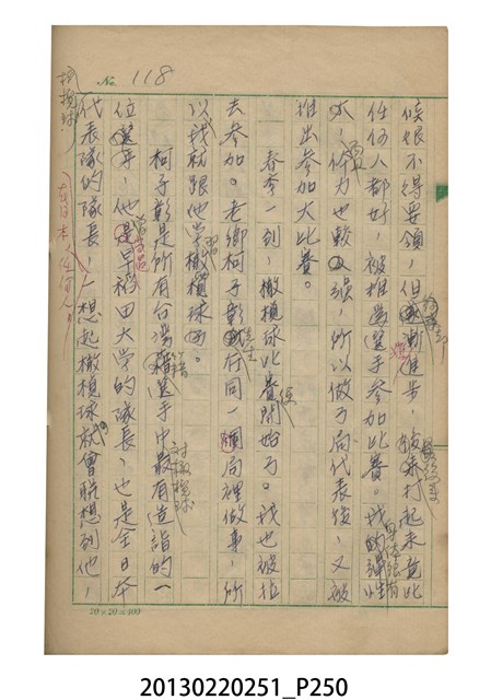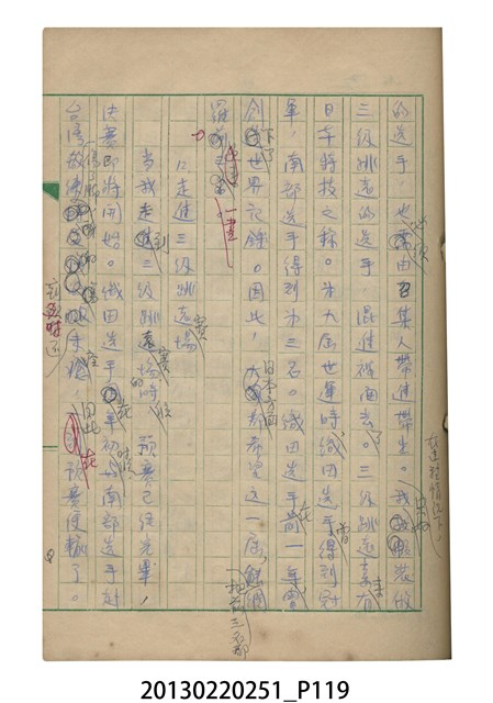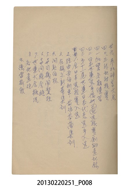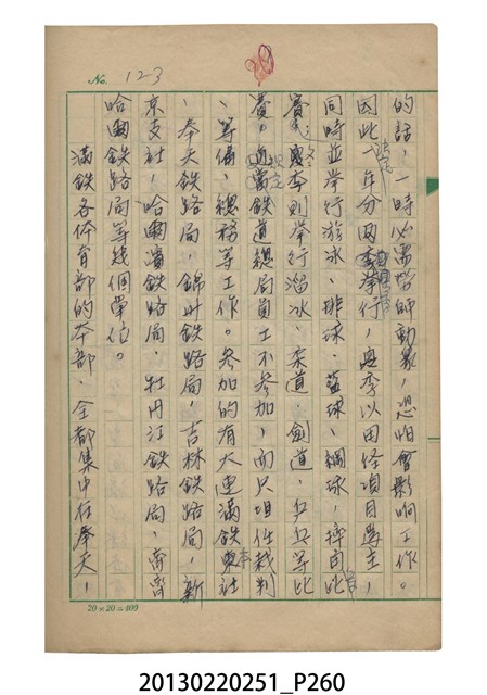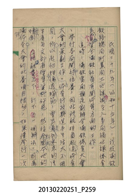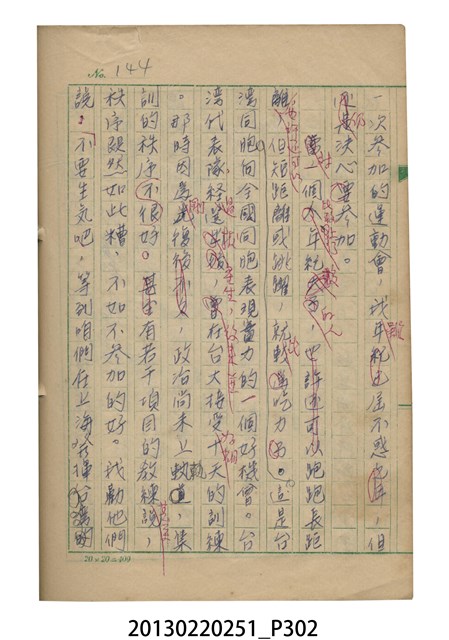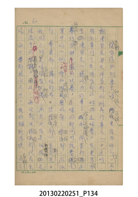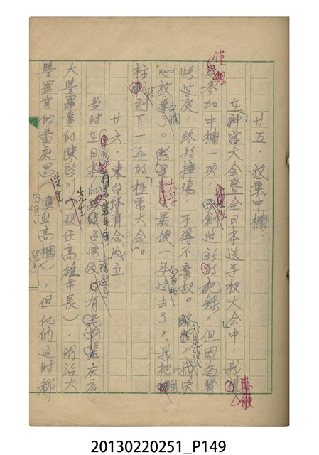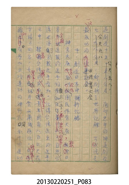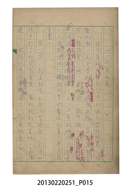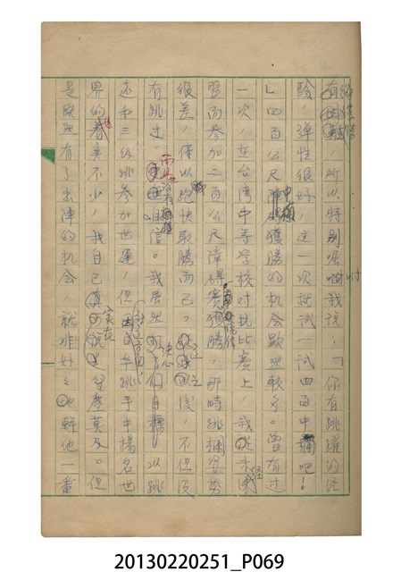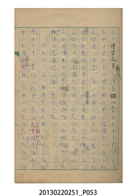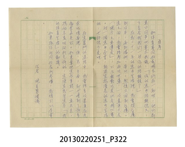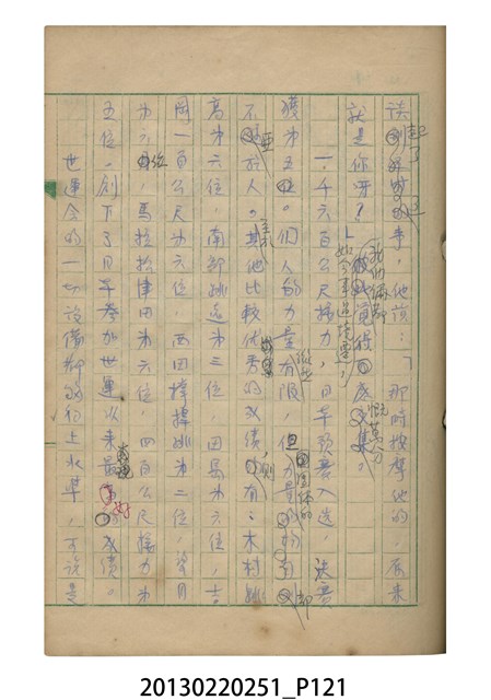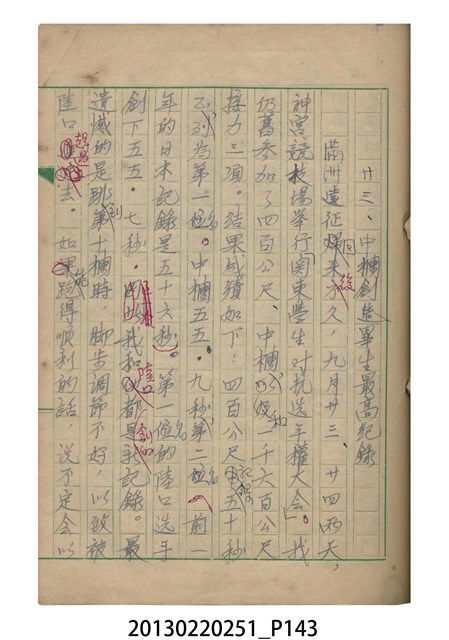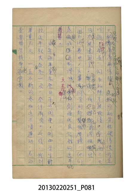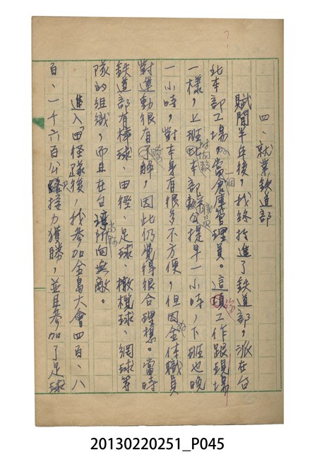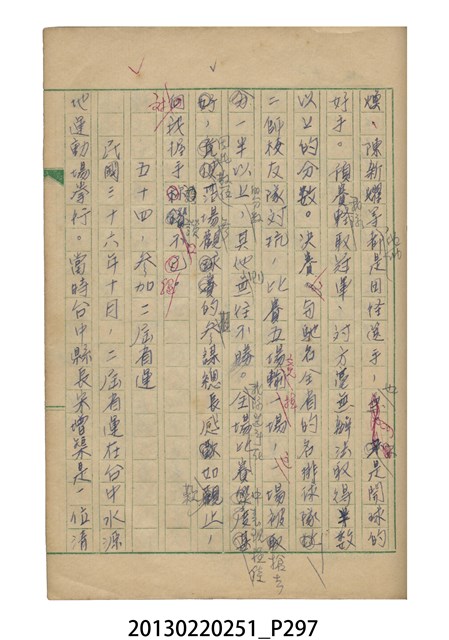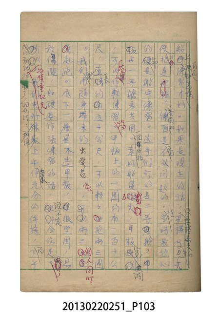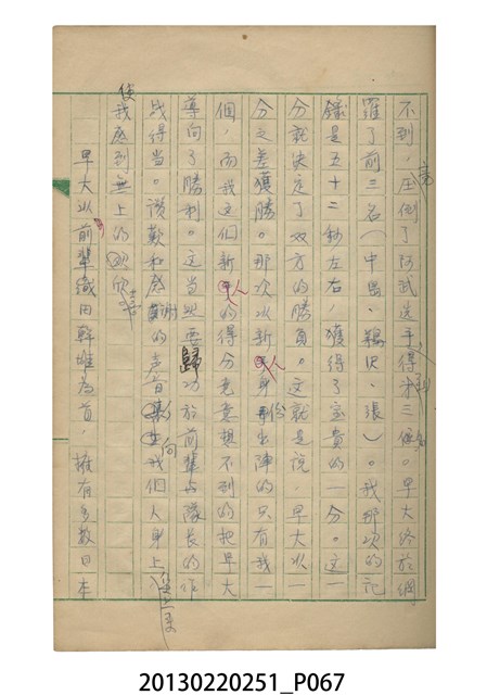 1.本物件為張星賢撰〈我的體育生活〉中文手稿謄本。封面為白色線裝,上面有手寫之「我的體育生涯」題名與「張星賢」簽名。目錄共分為65章,從少年時期(推測是1918年)開始,到1948年參加上海全國運動會之後高掛跑鞋為止,詳細陳述其運動生涯與心路歷程。