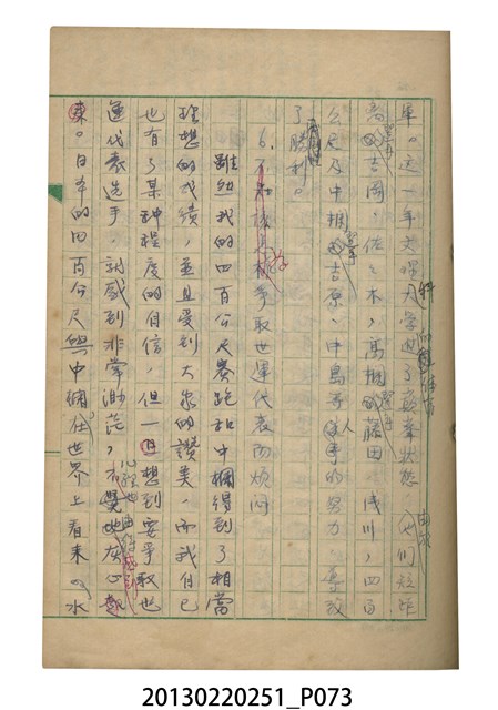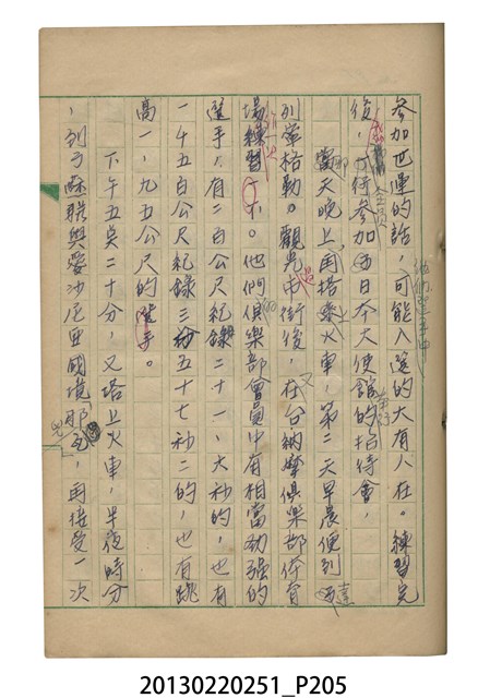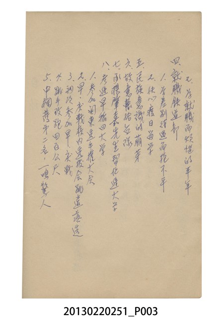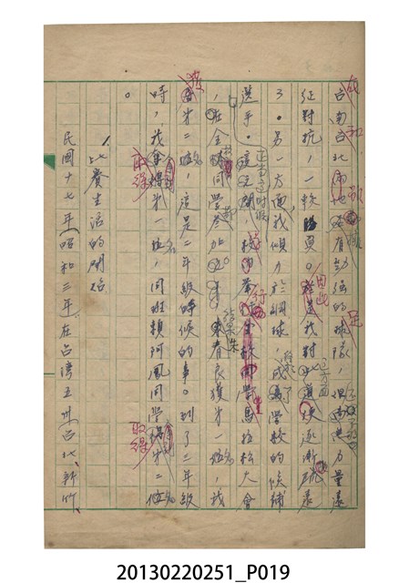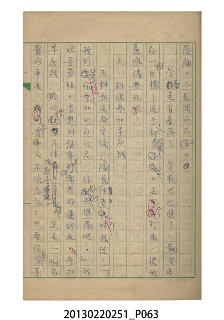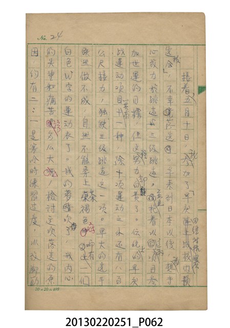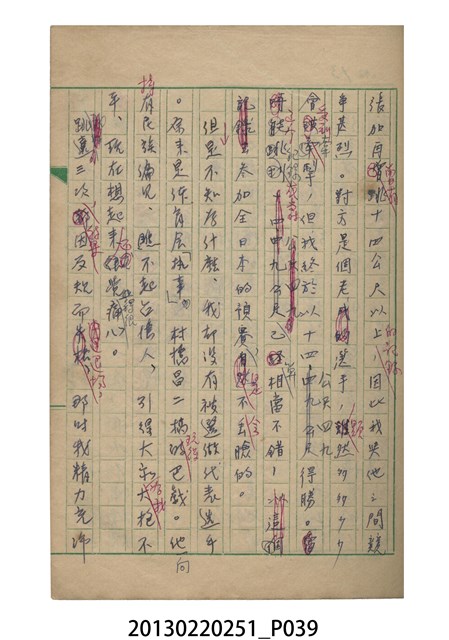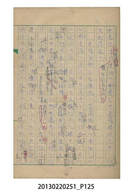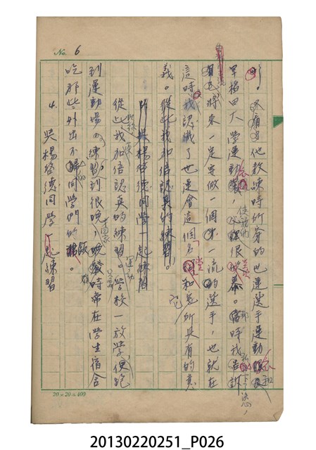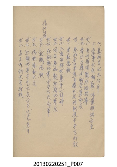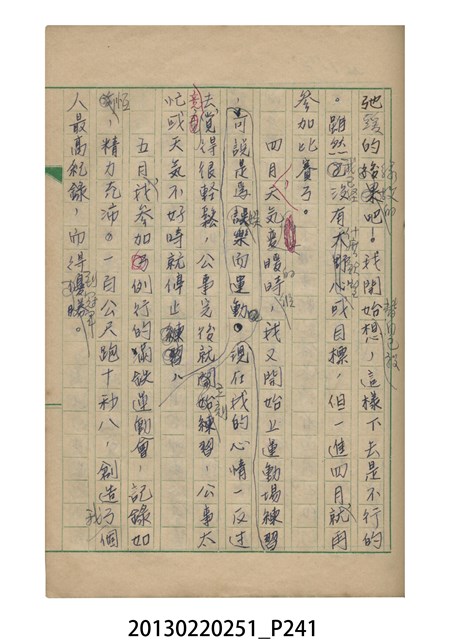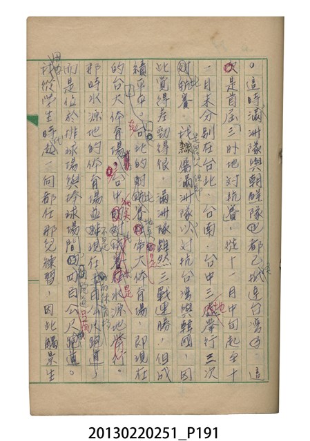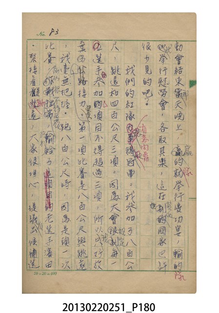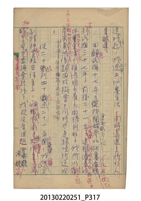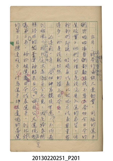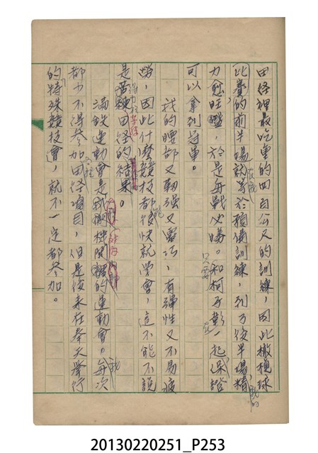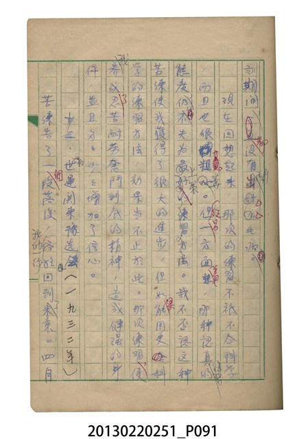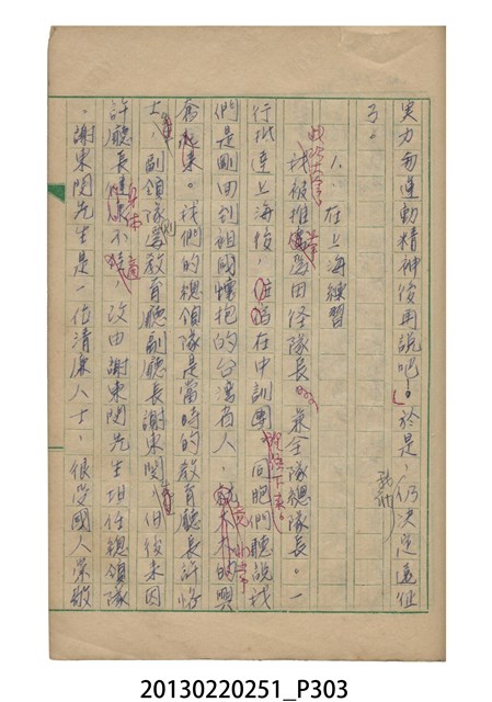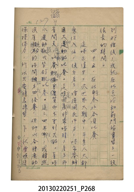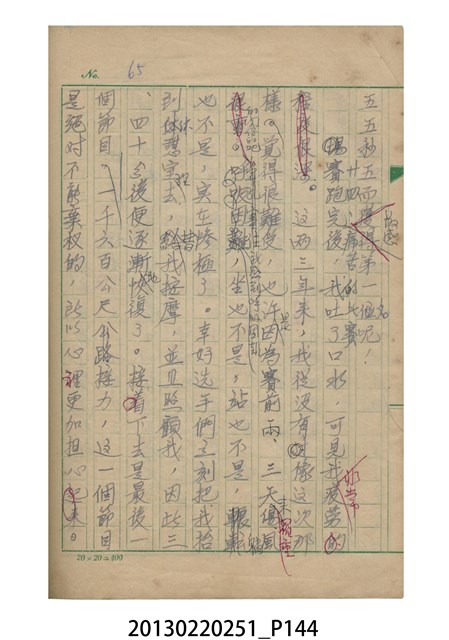 1.本物件為張星賢撰〈我的體育生活〉中文手稿謄本。封面為白色線裝,上面有手寫之「我的體育生涯」題名與「張星賢」簽名。目錄共分為65章,從少年時期(推測是1918年)開始,到1948年參加上海全國運動會之後高掛跑鞋為止,詳細陳述其運動生涯與心路歷程。
