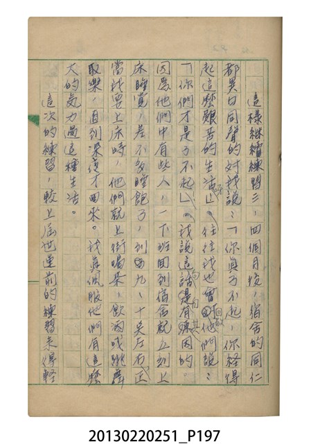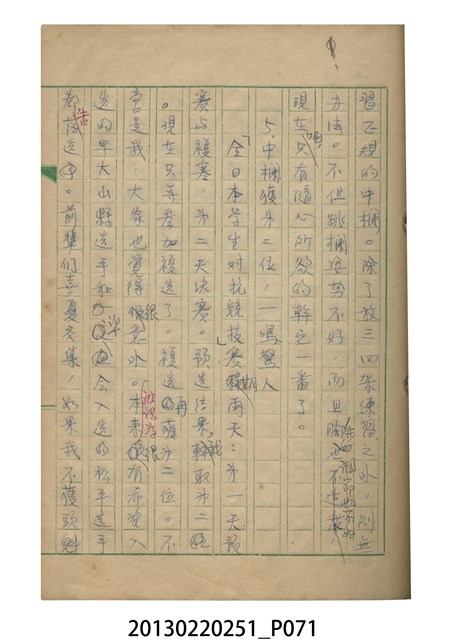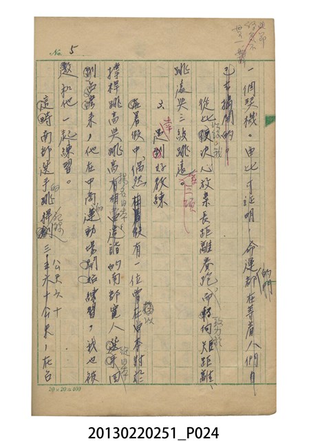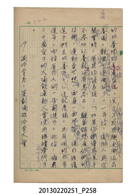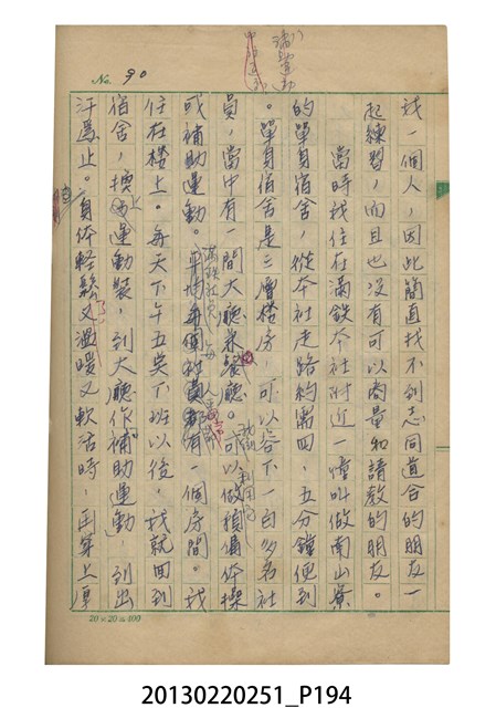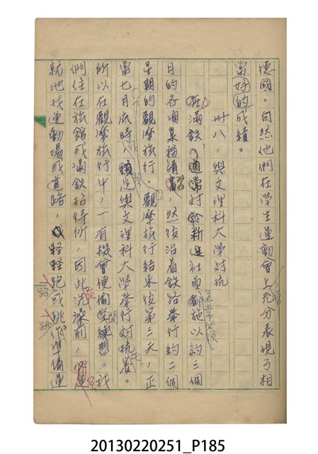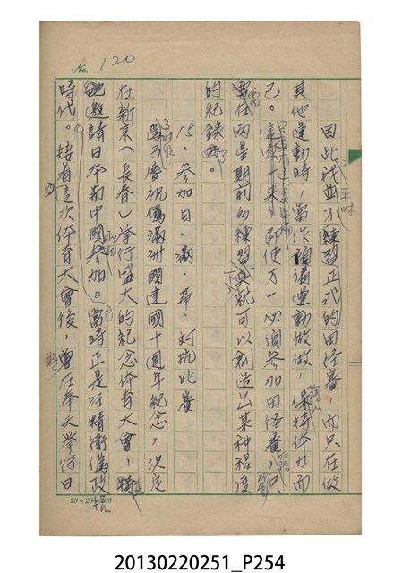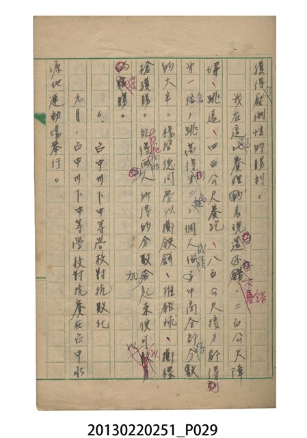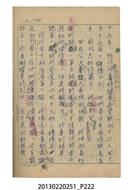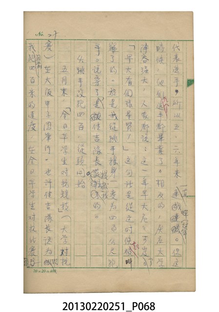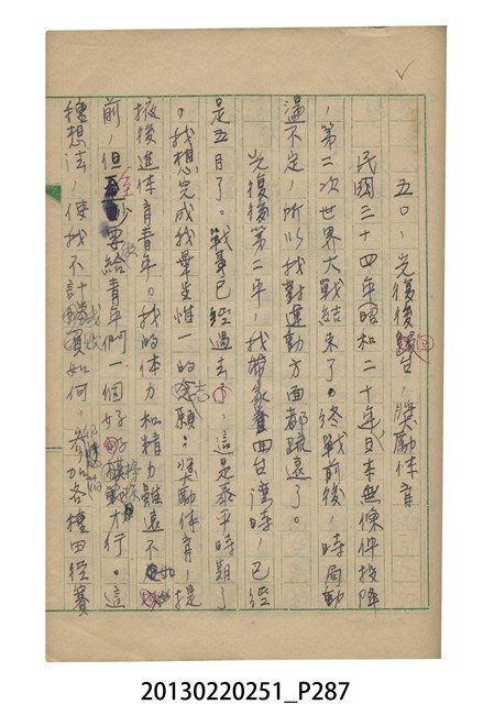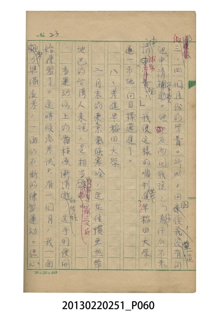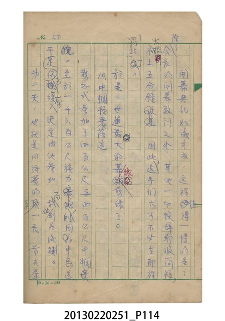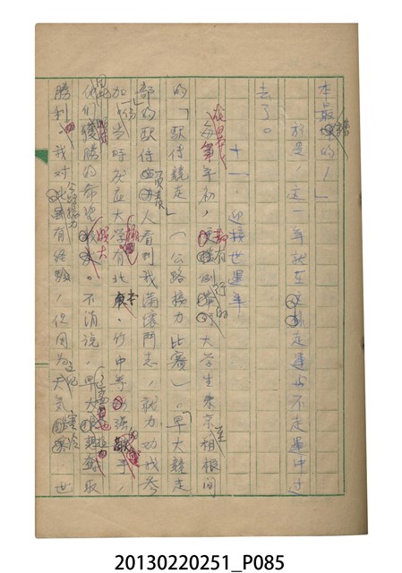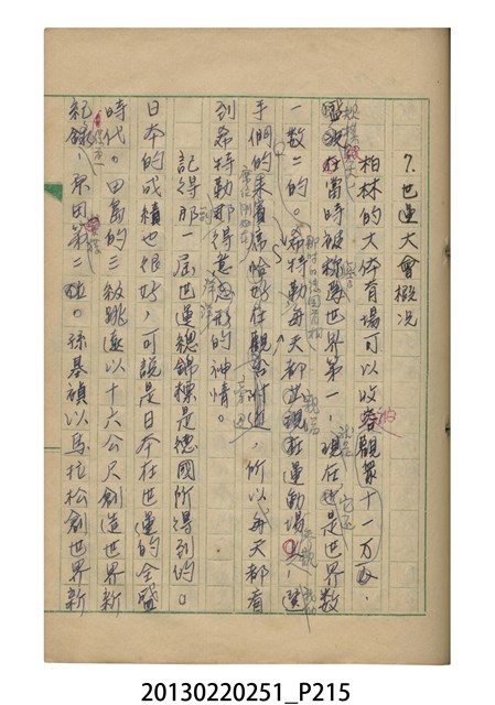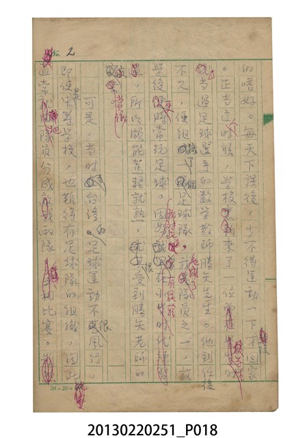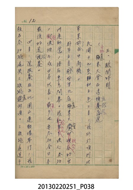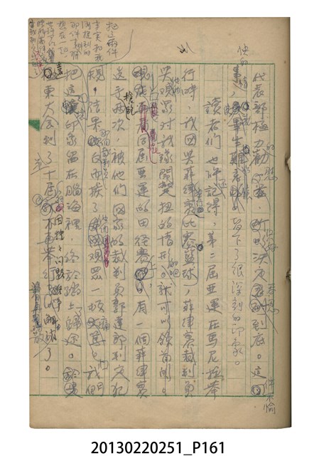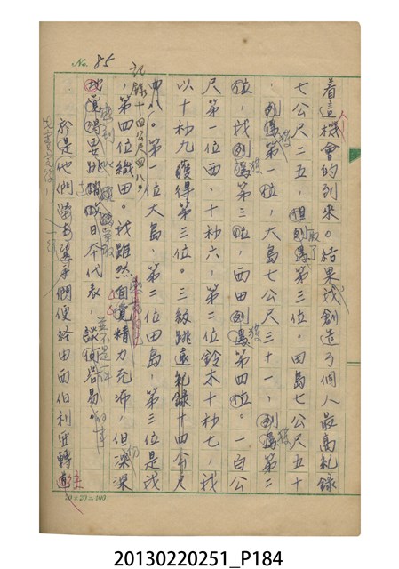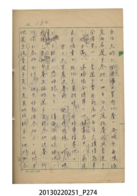 1.本物件為張星賢撰〈我的體育生活〉中文手稿謄本。封面為白色線裝,上面有手寫之「我的體育生涯」題名與「張星賢」簽名。目錄共分為65章,從少年時期(推測是1918年)開始,到1948年參加上海全國運動會之後高掛跑鞋為止,詳細陳述其運動生涯與心路歷程。
