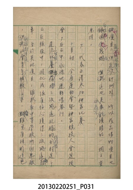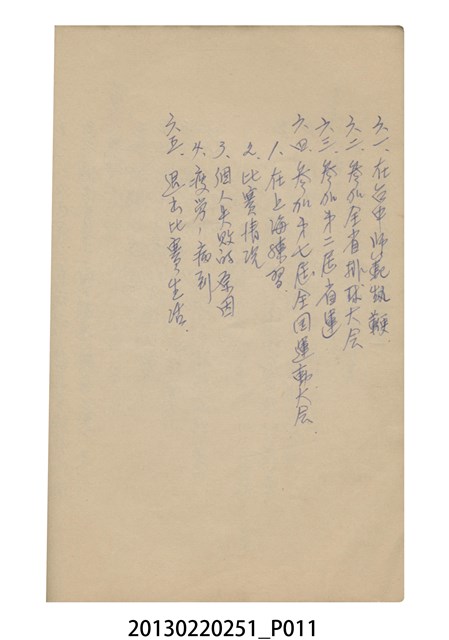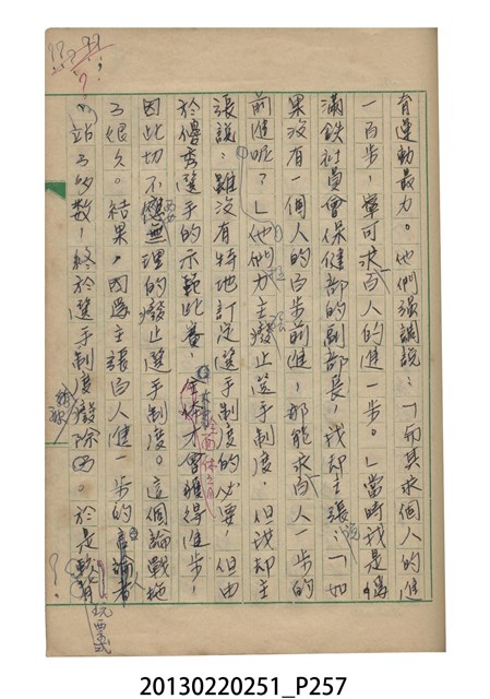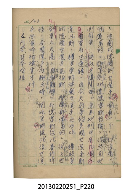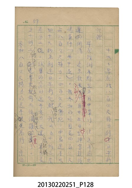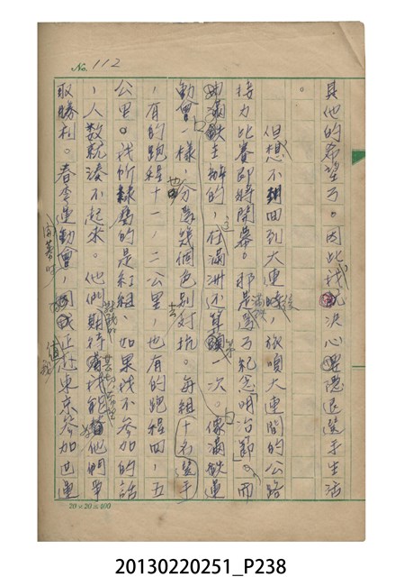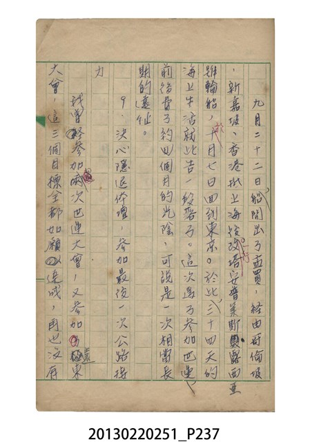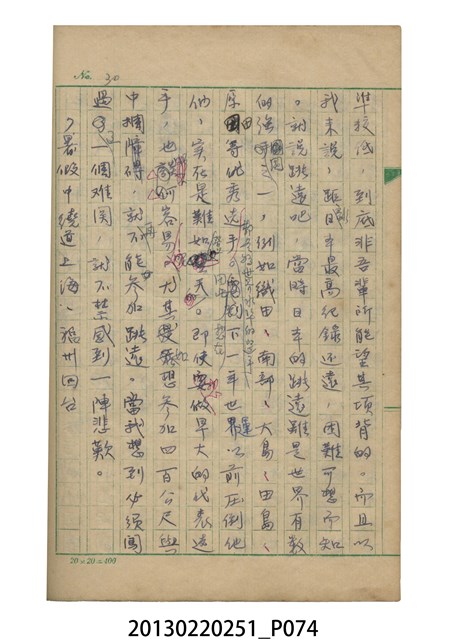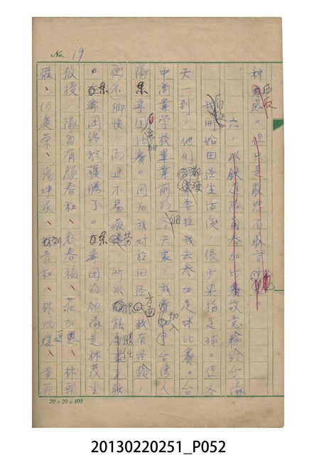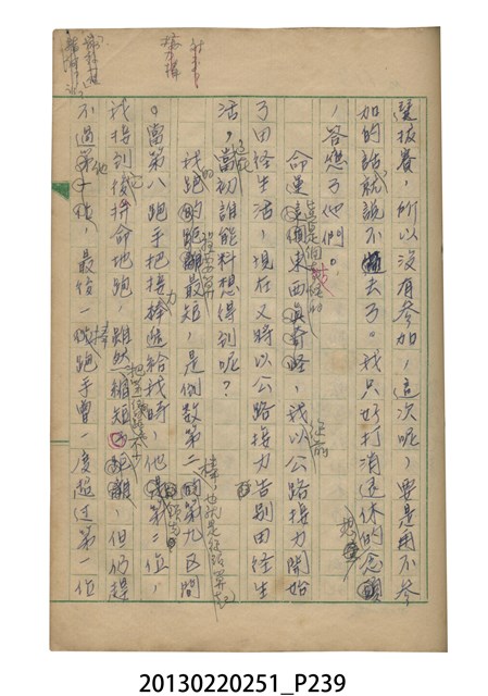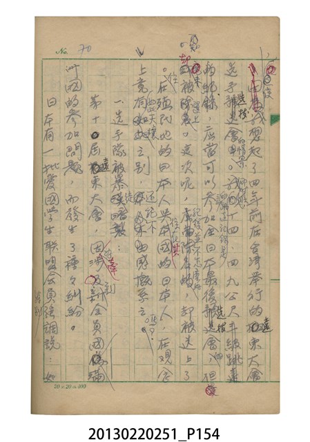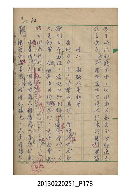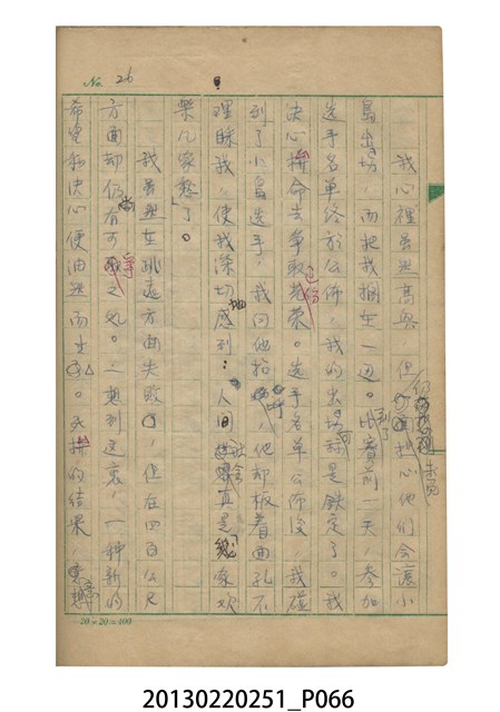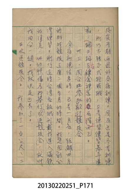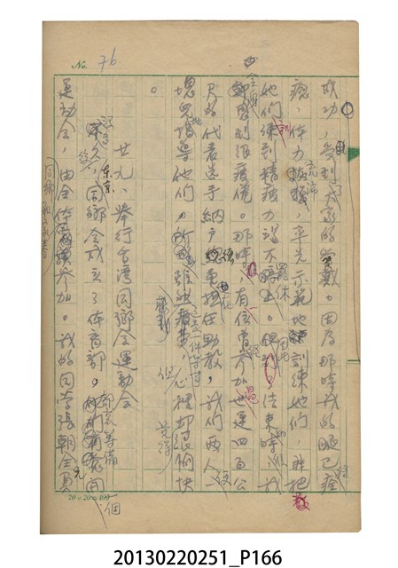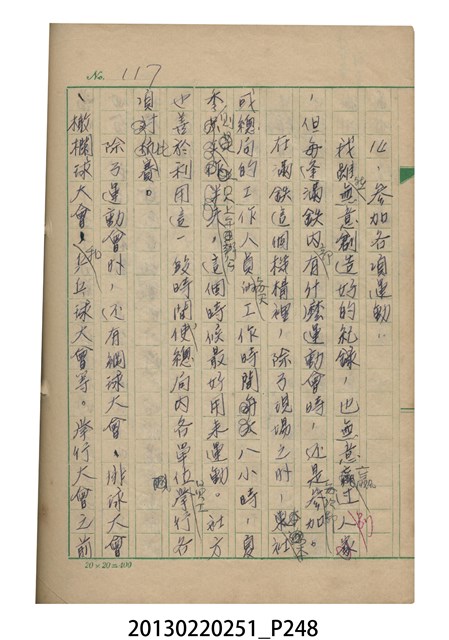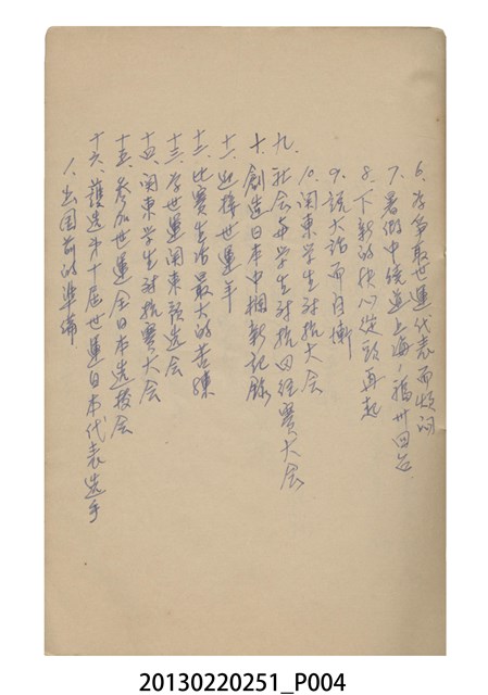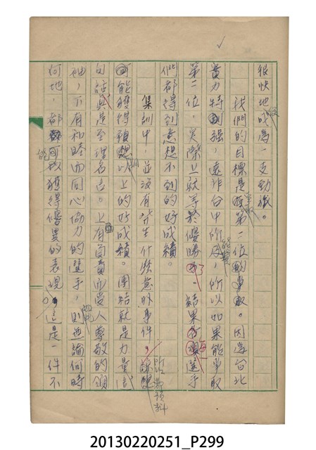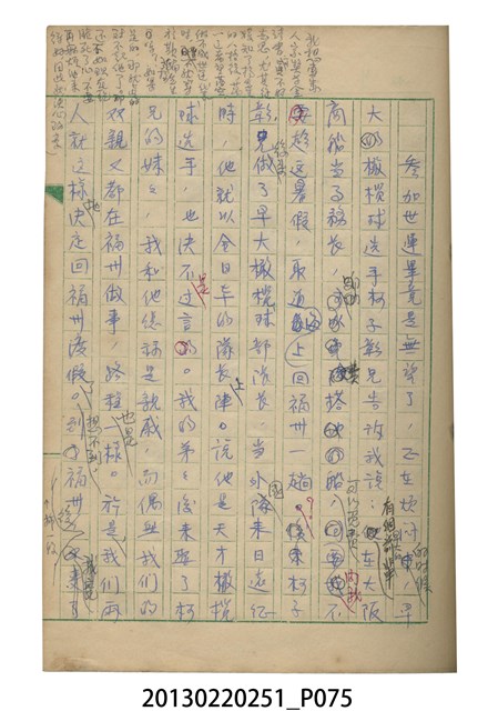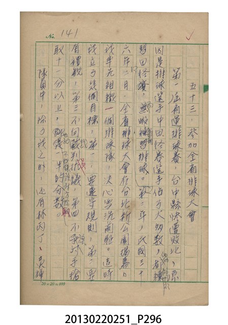 1.本物件為張星賢撰〈我的體育生活〉中文手稿謄本。封面為白色線裝,上面有手寫之「我的體育生涯」題名與「張星賢」簽名。目錄共分為65章,從少年時期(推測是1918年)開始,到1948年參加上海全國運動會之後高掛跑鞋為止,詳細陳述其運動生涯與心路歷程。