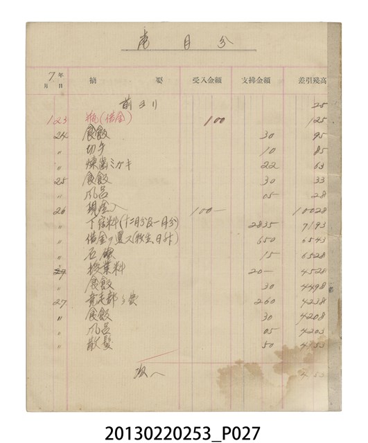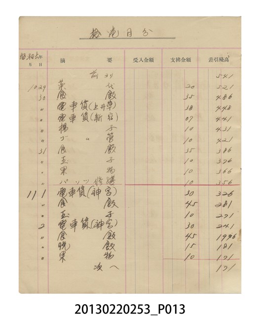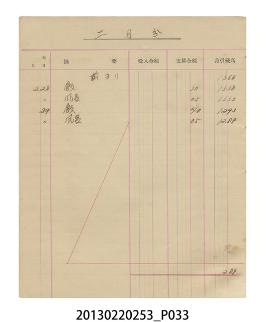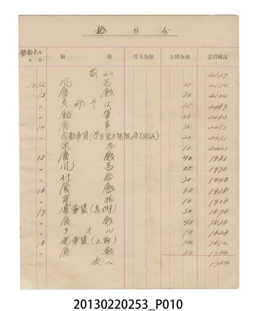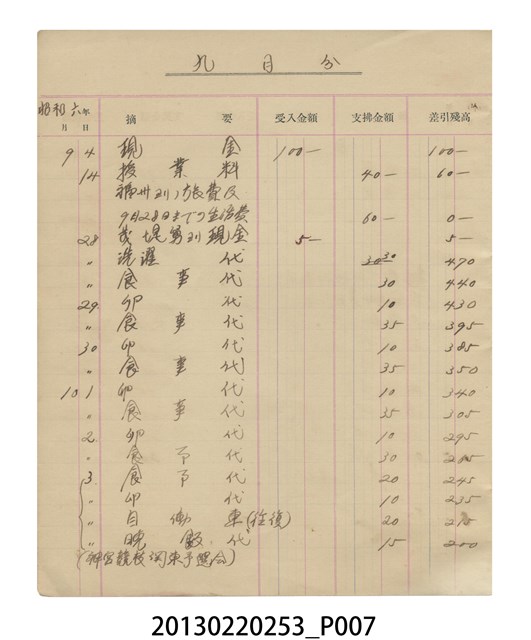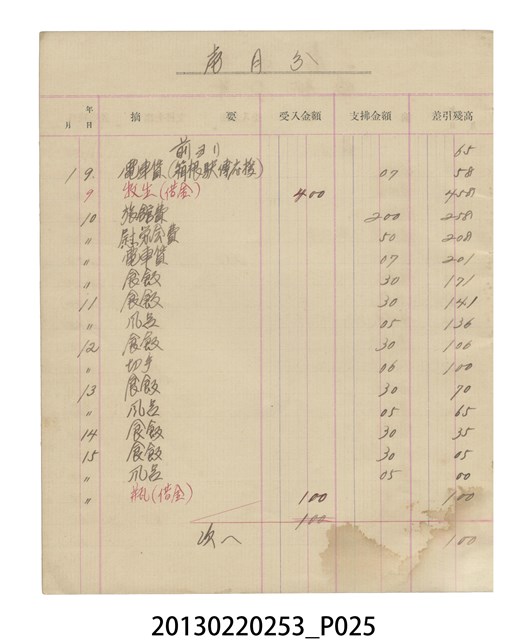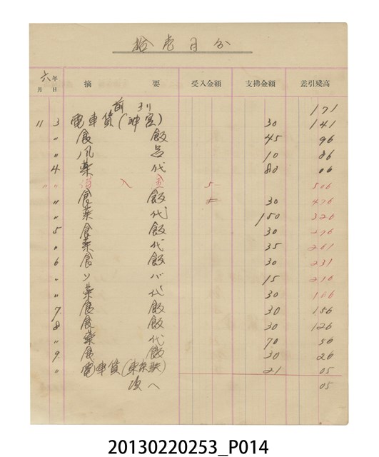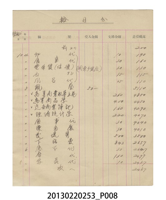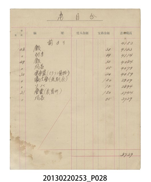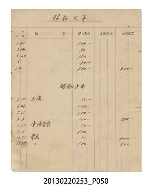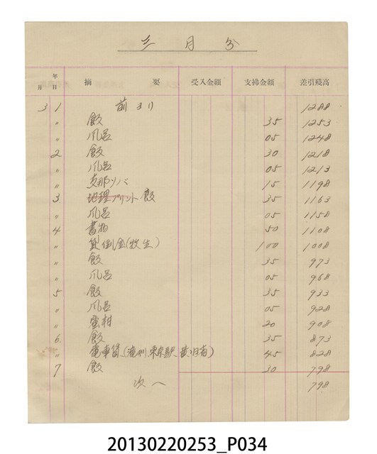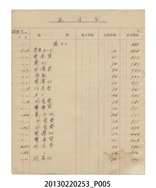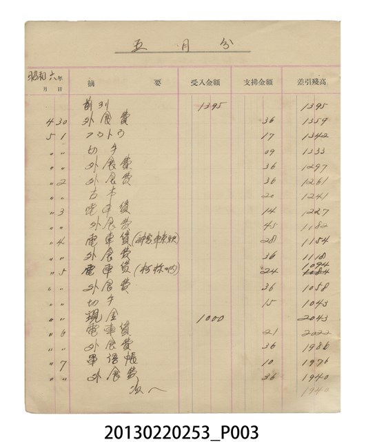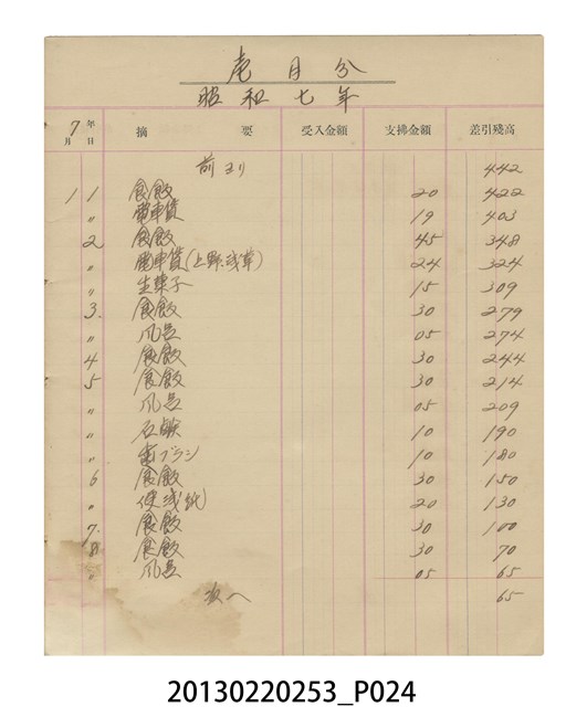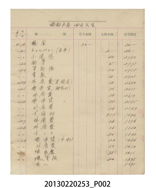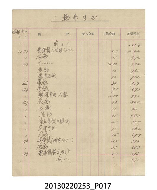 1.本物件為昭和6年張星賢記帳本,封面字樣為「小遣帳」,圖樣為樹枝上有2隻小鳥棲息,上方有2個心形圖樣。記帳本內容為自昭和6年(1931)4月起至昭和8年(1933)11月在日本的生活開銷,包含外食費、電車費、雜費、洗濯費、授業金、泡澡費用、購買文具用品、繪葉書與經濟學概論教科書等費用,並提及神宮競技關東予選會等賽事,足跡遍布臺灣、金澤、東京、新宿、上野、大阪等地。記帳本封底內頁有「MARUZEN STATIONERY DEPT.」、「丸善文房具」字樣。本物件紙質泛黃,邊緣有紅色汙跡。