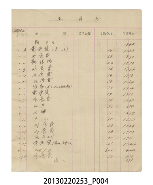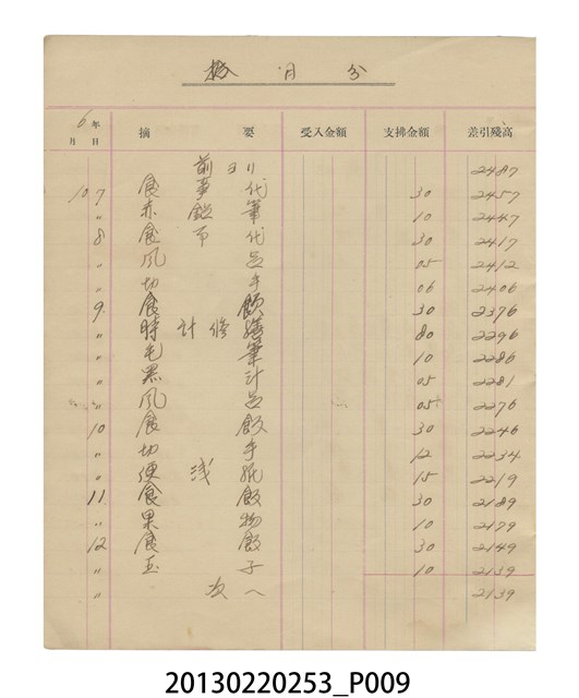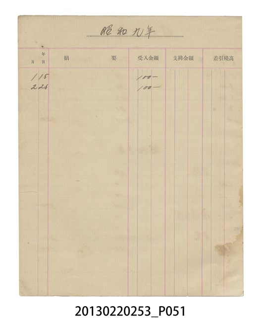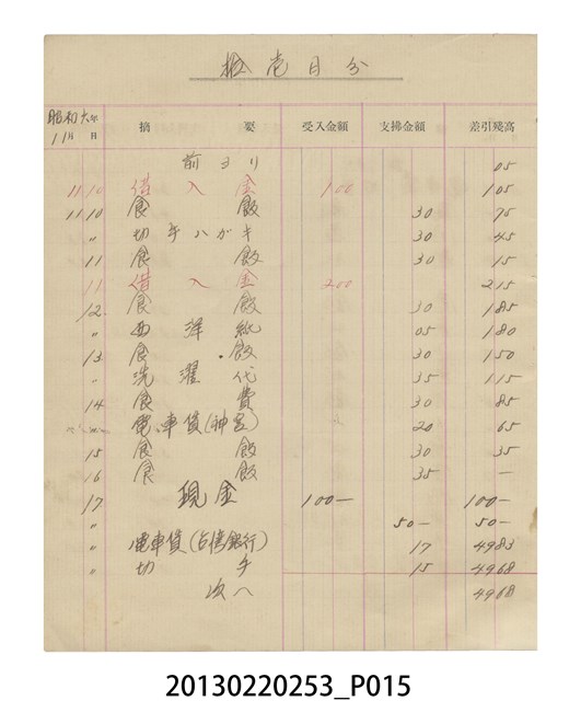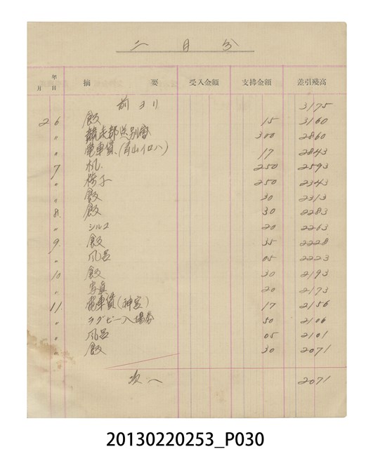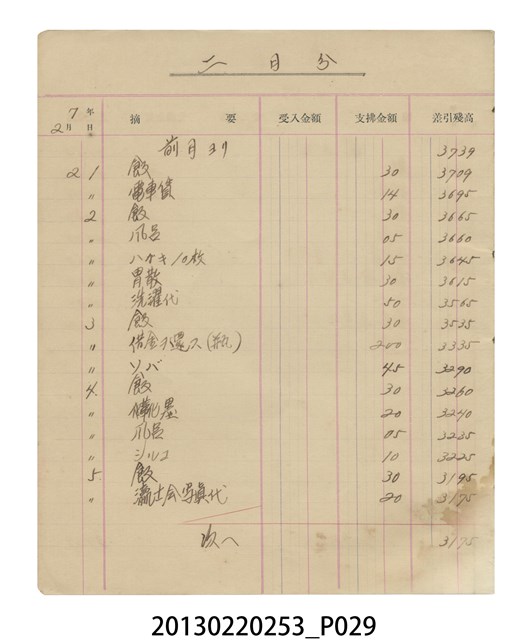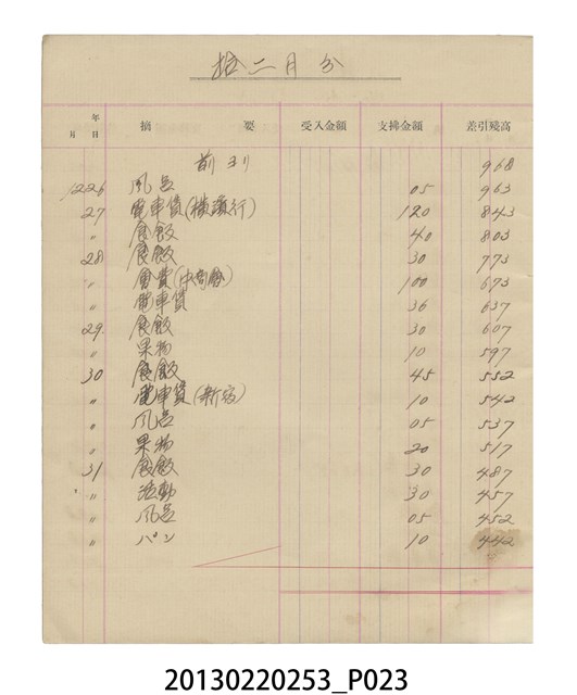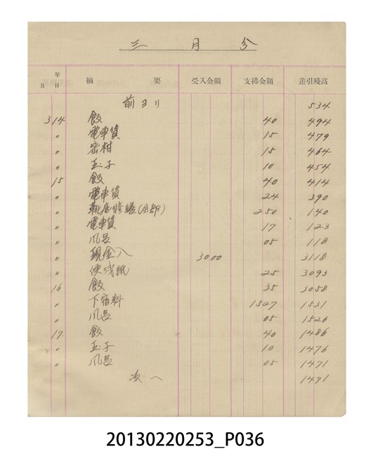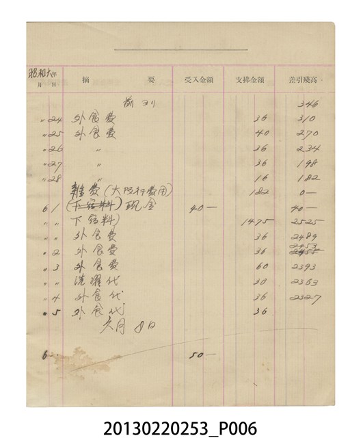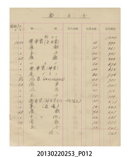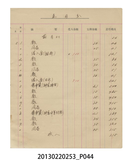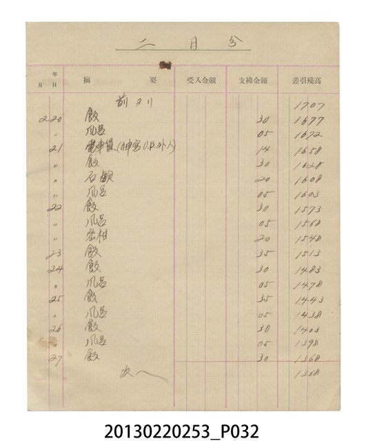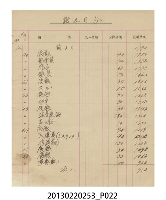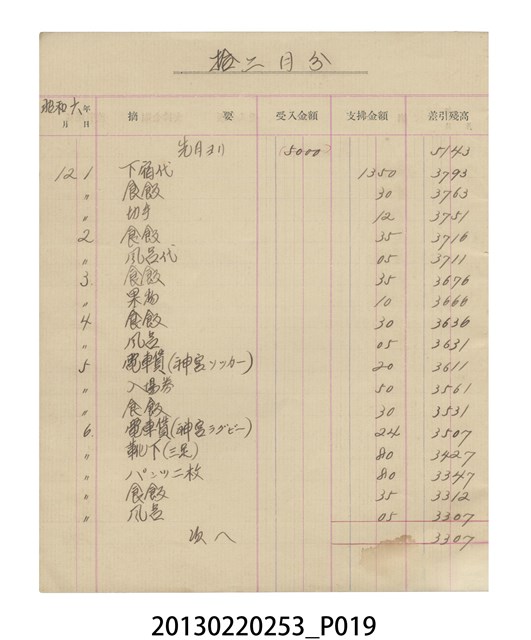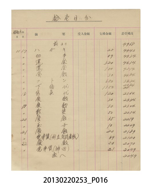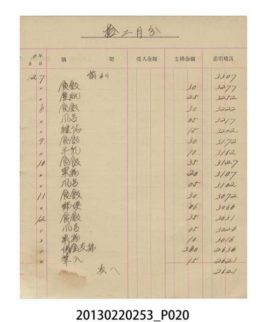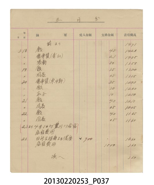 1.本物件為昭和6年張星賢記帳本,封面字樣為「小遣帳」,圖樣為樹枝上有2隻小鳥棲息,上方有2個心形圖樣。記帳本內容為自昭和6年(1931)4月起至昭和8年(1933)11月在日本的生活開銷,包含外食費、電車費、雜費、洗濯費、授業金、泡澡費用、購買文具用品、繪葉書與經濟學概論教科書等費用,並提及神宮競技關東予選會等賽事,足跡遍布臺灣、金澤、東京、新宿、上野、大阪等地。記帳本封底內頁有「MARUZEN STATIONERY DEPT.」、「丸善文房具」字樣。本物件紙質泛黃,邊緣有紅色汙跡。