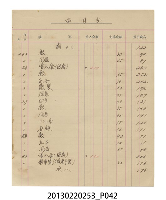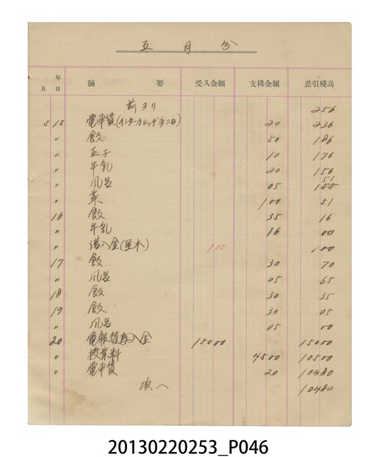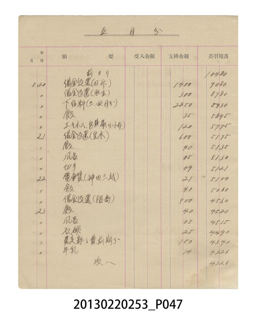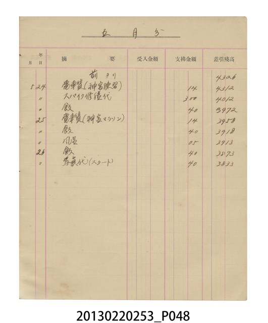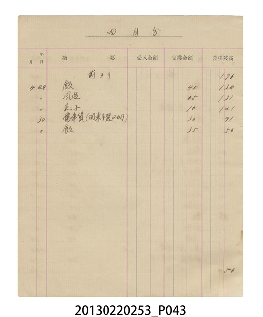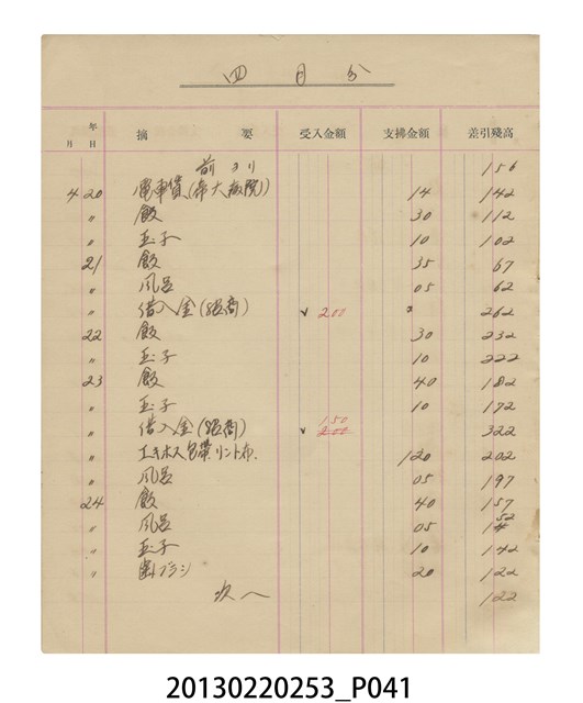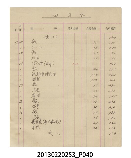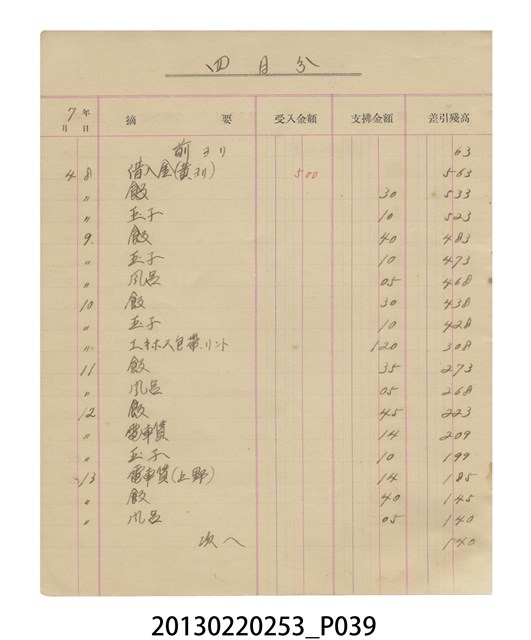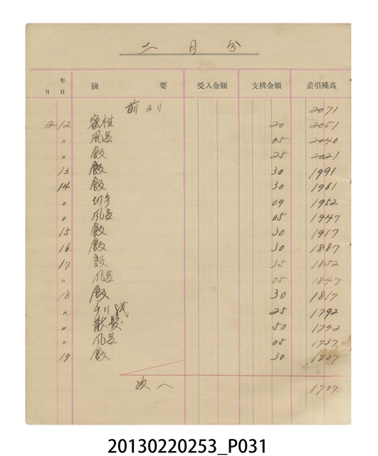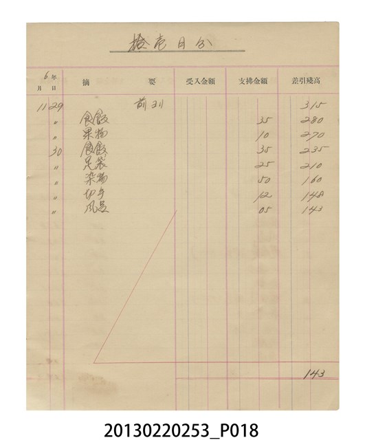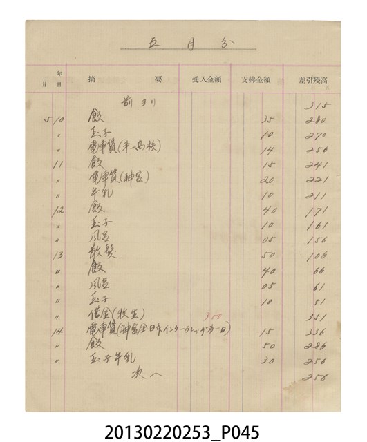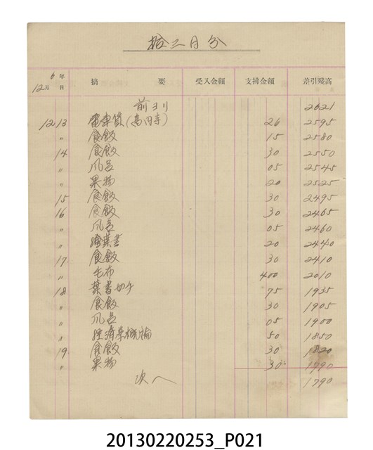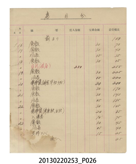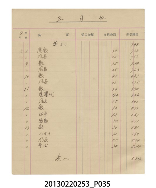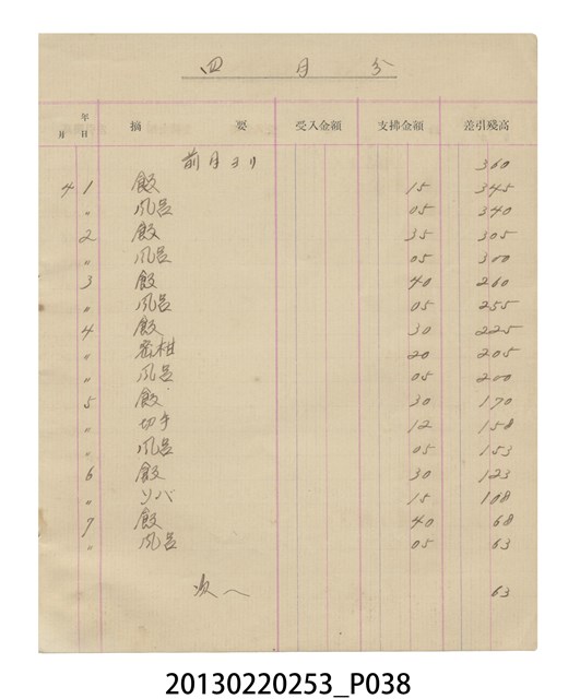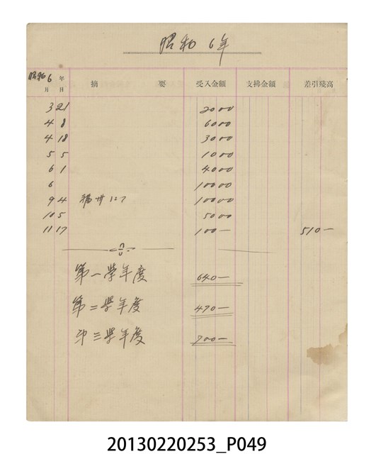 1.本物件為昭和6年張星賢記帳本,封面字樣為「小遣帳」,圖樣為樹枝上有2隻小鳥棲息,上方有2個心形圖樣。記帳本內容為自昭和6年(1931)4月起至昭和8年(1933)11月在日本的生活開銷,包含外食費、電車費、雜費、洗濯費、授業金、泡澡費用、購買文具用品、繪葉書與經濟學概論教科書等費用,並提及神宮競技關東予選會等賽事,足跡遍布臺灣、金澤、東京、新宿、上野、大阪等地。記帳本封底內頁有「MARUZEN STATIONERY DEPT.」、「丸善文房具」字樣。本物件紙質泛黃,邊緣有紅色汙跡。