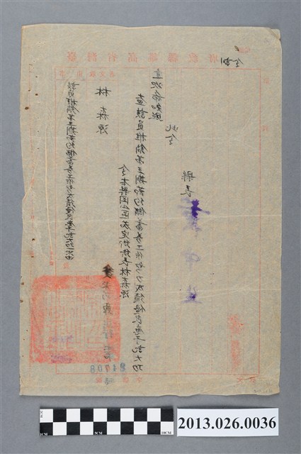 1950年高雄縣政府對茄萣鄉長林森源因推銷第三期節約儲蓄券工作努力成績優良記大功一次訓令。1949年國民政府撤退臺灣,大批的軍人駐紮在學校,影響學生的上課。政府為了使學生恢復正常上課,並籌措戰時經費,臺灣省政府公布「節約救國有獎儲蓄券發行辦法」,以「戡亂救國、提倡節約、獎勵儲蓄、穩定經濟」為由,發行3期的儲蓄券。當時的各地縣市政府政府為了協助節約儲蓄券發行,大力宣導且配額民眾購買。林森源先生擔任茄萣鄉鄉長,本物件正可作為當時節約儲蓄券發行時,地方首長推行的見證。資料來源:張敦智,《臺灣百年樂透》,頁149~156。