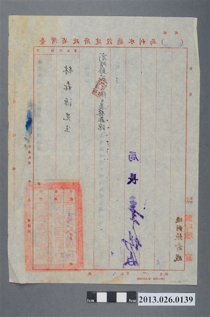 本物件為臺灣省建設廳水利局聘林森源為高雄水利委員會當然委員之聘書,文件上缺乏日期記載,然當時林森源先生仍為茄萣鄉鄉長,應為1950年至1956年之間所發之公文。