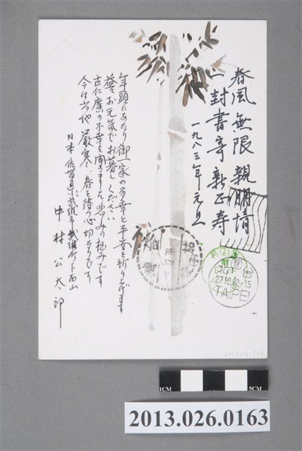 本物件為1983年林森源先生的日本友人中村公太郎寄給林森源的新年賀卡明信片。