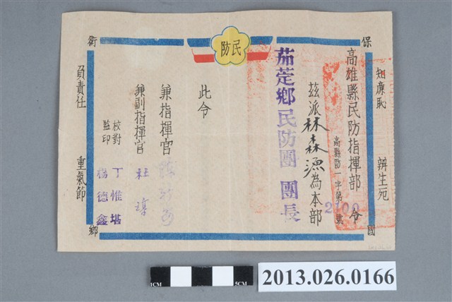 民防主要的任務為空襲防護、搶救災害、協助地方治安、戰時支援軍事勤務,民防工作係動員民間人力、物力,予以適當組織、訓練與運用,以協助維持社會治安及戰時支援軍事勤務工作。戰後初期臺灣民防工作充滿戰時組織色彩,民國39年臺灣省政府訂定「臺灣省民眾組訓實施辦法」,成立臺灣省及縣市反共抗俄動員委員會,縣市防護團改為反共自衛總隊,規定以省縣市政府鄉鎮區公所為民眾組訓機構,省級執行業務,由民政廳主辦,縣市級執行業務,由縣市政府軍事科主辦,縣市以下組設各級民眾反共自衛隊,組訓時以不妨害民眾原有職業及生計為原則,訂頒縣市各級民眾反共自衛隊編組規程與實施辦法。民國42年7月民防業務改由警察局及縣市軍事科、衛生院等單位擔任,於是將民防部隊整編為防護總隊、軍勤總隊、醫護大隊、婦女大隊及船舶總隊等。民國44年各縣成立民防指揮部,分局成立民防指揮所,而鄉改為四防團受臺灣警備總司令部指揮監督,辦理民防業務。(資料來源:《茄萣鄉志》,頁385。)本物件為1955年8月31日高雄縣民防指揮部派林森源為茄萣鄉民防團團長之派令,當時林森源擔任茄萣鄉鄉長,為茄萣鄉民防團團長。