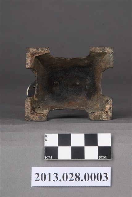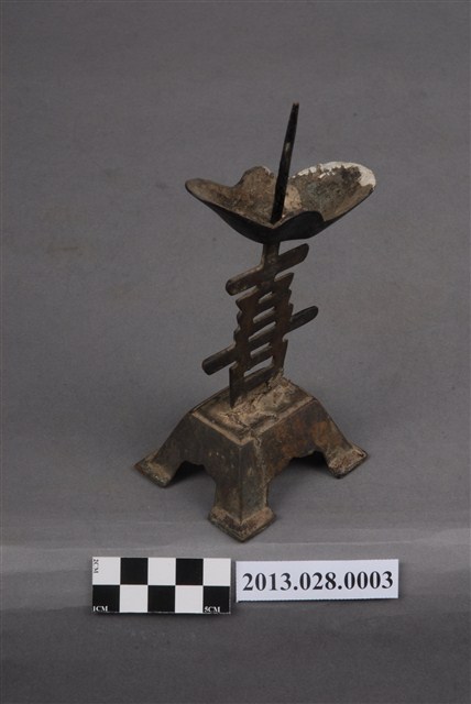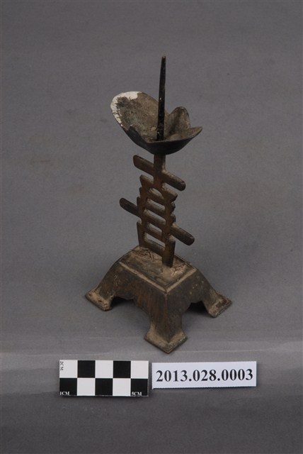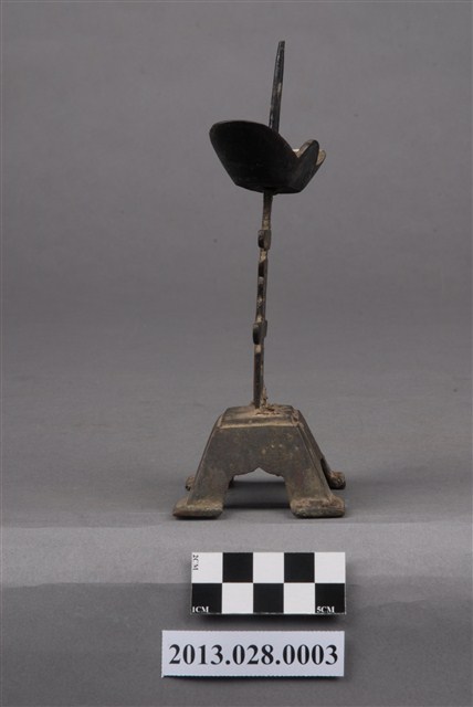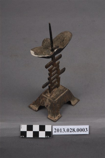 2、燭臺多為喜慶、祭祀之用。本件疑為錫製,以喜字為形。喜字上方延伸漸尖,穿過一元寶形托臺。尖處用以插置蠟燭、元寶形托臺則可穩固蠟燭底部並承接融溢出的蠟油。喜字下方為上窄下寬的梯形四足承座,喜字下方與承座間似有重製痕跡,疑曾斷裂過。
