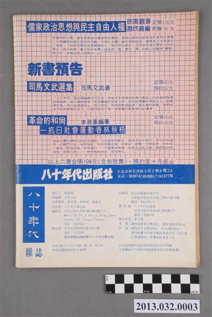 《八十年代》為1979年6月創辦的政論性雜誌,由時任立法委員康寧祥任發行人兼社長,司馬文武(江春男筆名)擔任總編輯。
