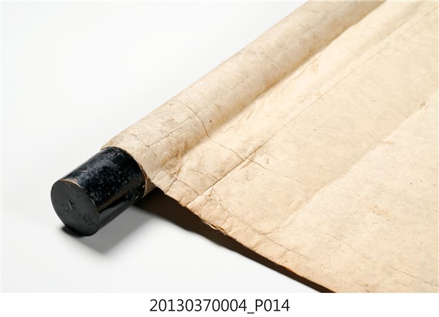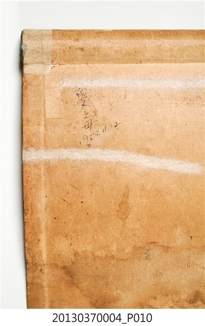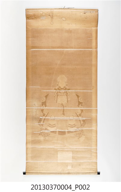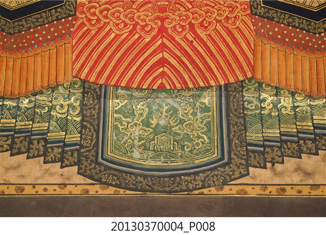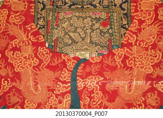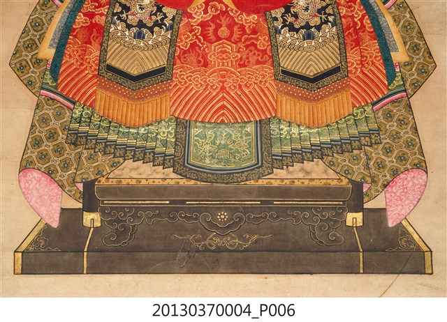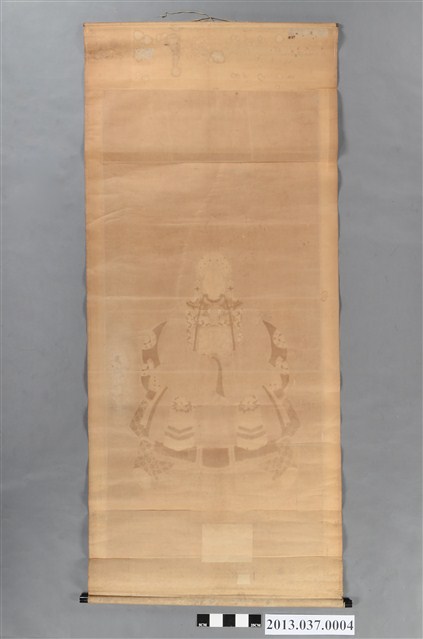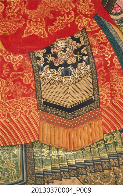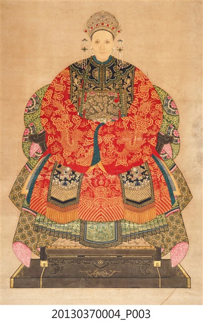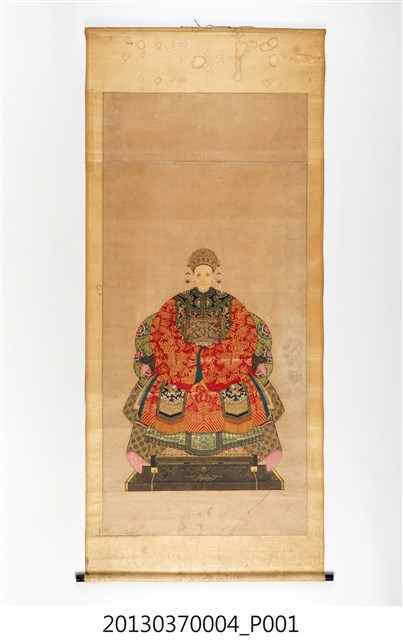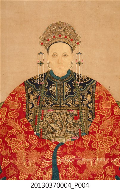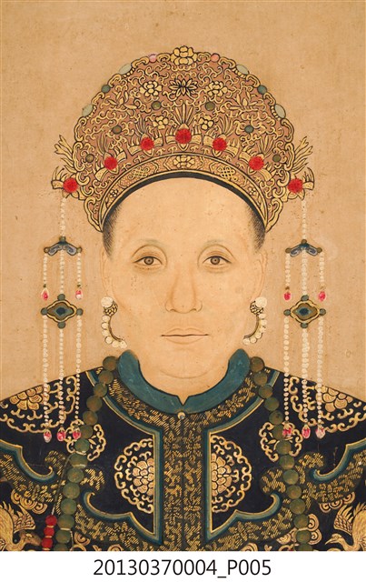 此幅祖先畫像,為第22世蘇國楊的妻子。通常女性的冠戴,是依照丈夫官品的大小來區分,因此畫中蘇國楊的妻子所著冠服前也有著五品文官白鷴補子。