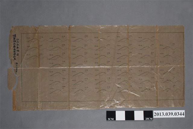 圖圍標示嘉南大圳新豐郡永康庄王田分線西勢地區防水堤防斷面高層,共標示43個堤防斷面。與館藏號2013.039.0335為同一組圖,推估本圖堤防施作位置靠道路面。與館藏2013.039.0343同一張。(陳怡菁撰寫)