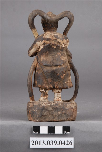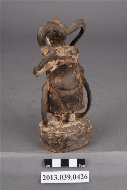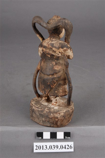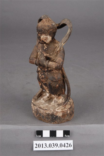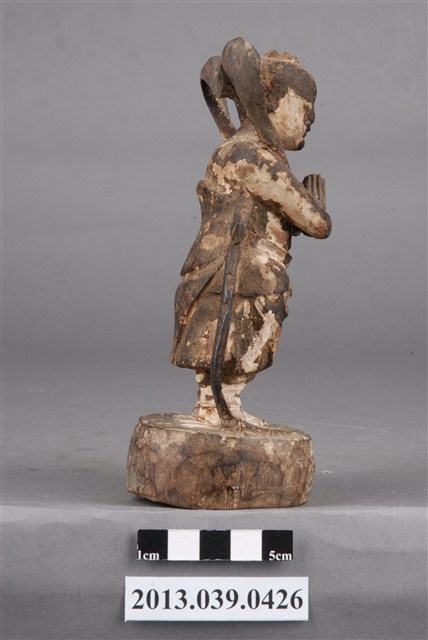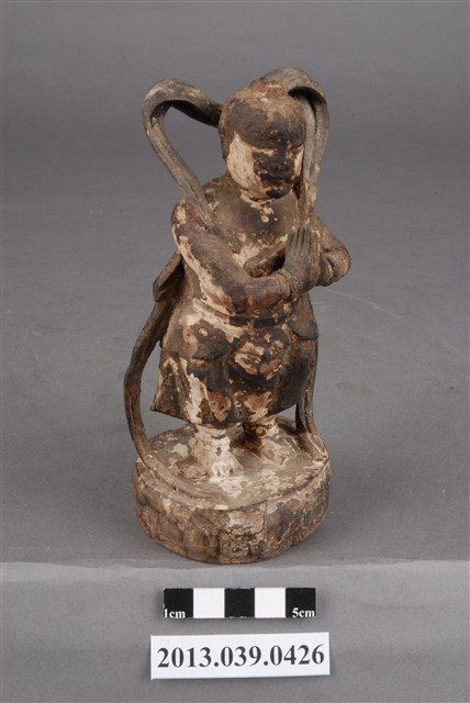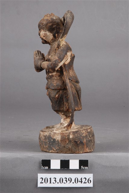 木刻形制,站在觀音菩薩旁之微笑男童,即善才,與龍女合稱金童玉女。