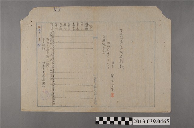 昭和13年嘉南大圳曾文郡部林鳳營灌溉監視所的特殊土地改良調查,表格由技手薗邊留吉進行調查規劃,其灌溉範圍包括東中社、西中社、羅水、東林鳳營、西林鳳營、龜子港、北龜子港、鐵線橋等地。(陳怡菁撰寫)