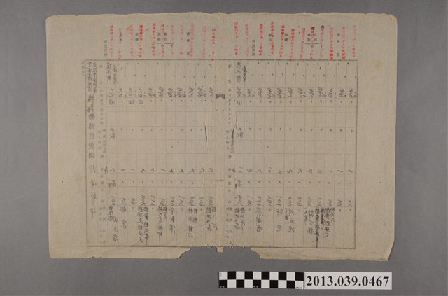 1. 本件為〈太子宮分線埋防並浚渫補修工事土取補償費調新營郡部〉上半部分(補償甲),為嘉南大圳組合新營郡部修補太子宮分線時,對於取用土地的補償費調查。2. 調查時間為昭和18年(1943)5月24至8月25日,地點為鹽水街番子厝。3. 欄位分別為:地名、地番、地目、使用面積、地上物件(種類/收穫見込)、數量、單價、小計、持主又ハ小作人住所氏名。4. 接受補償者有鐵線橋的周永昌、八老爺的劉北鴻、八老爺的許萬福等人。5. 依據內容推測,本件與館藏2013.039.0454、0455、0459、0460、0461、0462、0463、0466、0478、0515、0518有關,為新營郡部於昭和14年(1939)土地補償調查下的一環。(曾明德撰寫)