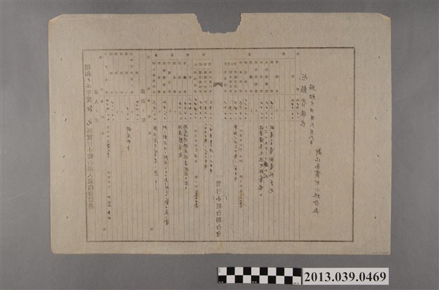 1. 本件實行小組合歲出歲入預算書,為館藏2013.039.0525新化灌溉監視所應新化郡部指示,將該年度各個實行小組合預算與決算報告,回覆新化郡部長的公文附件之一。館藏2013.039.0468~0477等預算書經考證應為此公文之附件。2. 新化頂區屬於新化郡部新化灌溉給水區域內,為新化灌溉監視所管轄。3. 本件報告時間為昭和14年(1939)6月6日,推測為該年度嘉南大圳組合的通常組合會(即預算總會)前提出的報告。※本報告為小數點後無條件捨去法、四捨五入法並用。4. 嘉南大圳實行小組合歲入歲出預算書的格式如下:(1)歲入ノ部:小組合費、繰越金(繰越し,即結轉,carry forward;繰越金,即結轉金額 ,amount carried forward)、補助金、寄附金(捐贈金額)、雜收入、過年度未收入金(2)歲出ノ部:事務費的項目,有聯合會負擔金、徵收費、徵收獎勵費、消耗品費、備品費、慰勞金、會議費。事業費分三個項目:I. 水稻區費有給水路費、應急補修費、灌溉管理費、共同苗代費II. 甘蔗區費則有給水路費、應急補修費、灌溉管理費III. 其他則有排水路費、構造物費、農道費、補助獎勵費、視察費、共同處辨費、雜費、準備金。5. 本件細部說明:(1)小組合費:一甲當負擔9圓7錢*74.63甲=約727圓(2)雜收入:貯金利子(即存金利息,在日文的脈絡下,「貯金」為向郵局或者農業協會,漁業協會寄存現金,「預金」則是向銀行或者信用金庫寄存現金)(3)聯合會負擔金:聯合會予算書の通り(依照聯合會預算書)(4)徵收獎勵費:納入期間に納付したる者に対する一割々戻し金(在繳交期內付款的人,可享有10%的退款)(5)慰勞金:役員慰勞金30圓(6)會議費:總會、臨時總會、役員打合せ會ひ(會ひ,推測為「會費」之簡寫)(7)水稻區之給水路費:64錢/坪*382.46坪,約244圓(8)水稻區灌溉管理費:(通水專任管理人)70錢/日*122日=約85圓(9)水稻區共同苗代費:50圓/甲*1.3甲=65圓(10)甘蔗區灌溉管理費:1圓60錢/昼(晝)夜*15日=24圓(11)排水路費:60錢/坪*109.85坪=約66圓(12)視察費:役員優良先進地視察旅ひ(旅ひ,推測為「旅費」之簡寫)(13)共同處辨費:レベルスターフ購入代(レベルスターフ,即level staff,水準尺;購入代,購買時所需費用)(14)雜費:測量人夫賃、測量杭、其他(杭,即木樁)(曾明德撰寫)