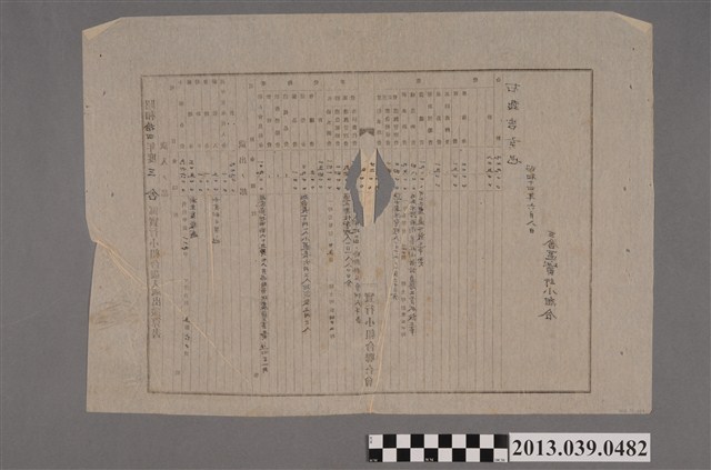 1. 本件實行小組合歲出歲入預算書,與館藏2013.039.0480~0483、0486~0493、0495同為善化灌溉區底下之實行小組合。根據館藏2013.039.0468~0477推測,這批善化灌溉區的預算書應是善化灌溉監視所負責人,向新化郡部長提出公文的附件,但目前尋無此公文。2. 三舍區屬於新化郡部善化灌溉給水區域內,但尚不能判斷是屬於東勢寮、加拔、善化、新市或是道爺監視所管轄。3. 本件報告時間為昭和14年(1939)6月8日,推測為該年度嘉南大圳組合的通常組合會(即預算總會)前提出的報告。4. 嘉南大圳實行小組合歲入歲出預算書的格式如下:(1)歲入ノ部:小組合費、繰越金(繰越し,即結轉,carry forward;繰越金,即結轉金額 ,amount carried forward)、補助金、寄附金(捐贈金額)、雜收入、過年度未收入金(2)歲出ノ部:事務費的項目,有聯合會負擔金、徵收費、徵收獎勵費、消耗品費、備品費、慰勞金、會議費。事業費分三個項目:I. 水稻區費有給水路費、應急補修費、灌溉管理費、共同苗代費II. 甘蔗區費則有給水路費、應急補修費、灌溉管理費III. 其他則有排水路費、構造物費、農道費、補助獎勵費、視察費、共同處辨費、雜費、準備金。※本報告為四捨五入法。5. 本件細部說明:(1)小組合費:5.6圓/甲*119甲,約666圓(2)繰越金:前年度繰越(3)雜收入:予金利子(即「預金利子」,即存金利息)其ノ他(4)聯合會負擔金:經常負擔甲當65錢78圓、臨時負擔農道工事費之16℅為31圓(5)慰勞金:組合長12圓*1人;小區長6圓*3人;相談役(即顧問)3圓3*人(6)水稻區之給水路費:35錢/坪*402坪,約140圓(7)水稻區灌溉管理費:通水專任管理人1人80錢/日*80日=64圓(8)水稻區共同苗代費:共同苗代(秧苗)用地2甲的贌耕料(贌在文本原字為「貝卜」,依據歷史脈絡推測為贌耕費)及管理人平當(9)甘蔗區灌溉管理費:通水專任管理人1日1人80錢,30日分(10)排水路費:30錢/坪*320坪=約96圓(11)構造物費:補助水路、新市善化間新設道路土管伏設工事(12)農道費:第三區農道施設工事費(曾明德撰寫)
